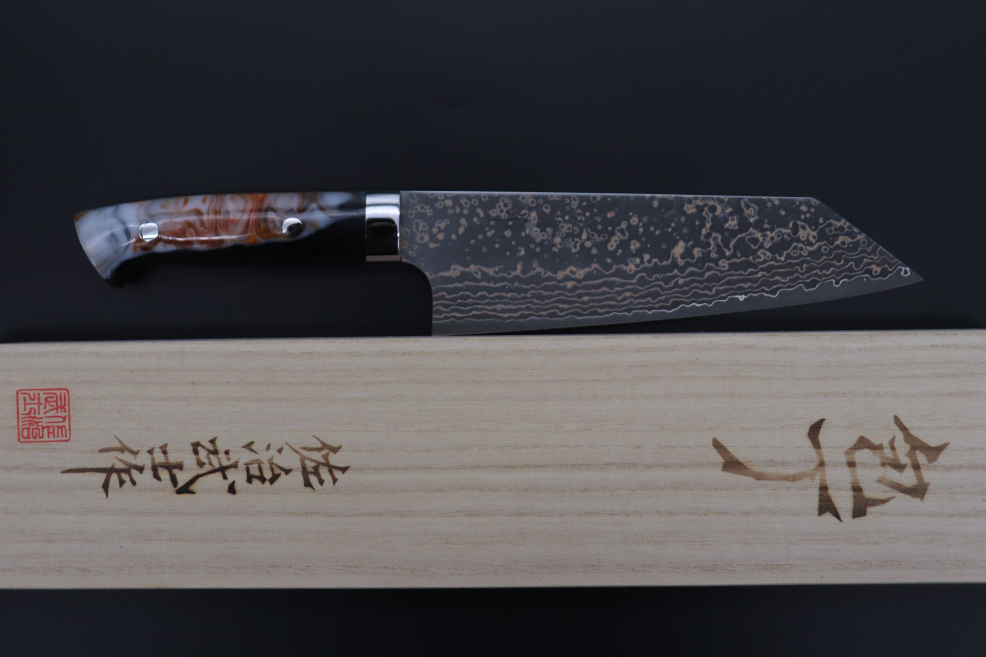 Knife Model: Takeshi Saji SUMMIT ― Limited Edition Custom Series SMT-1076 VG-10W Multi-Colored Golden-Rainbow Damascus Bunka 175mm
