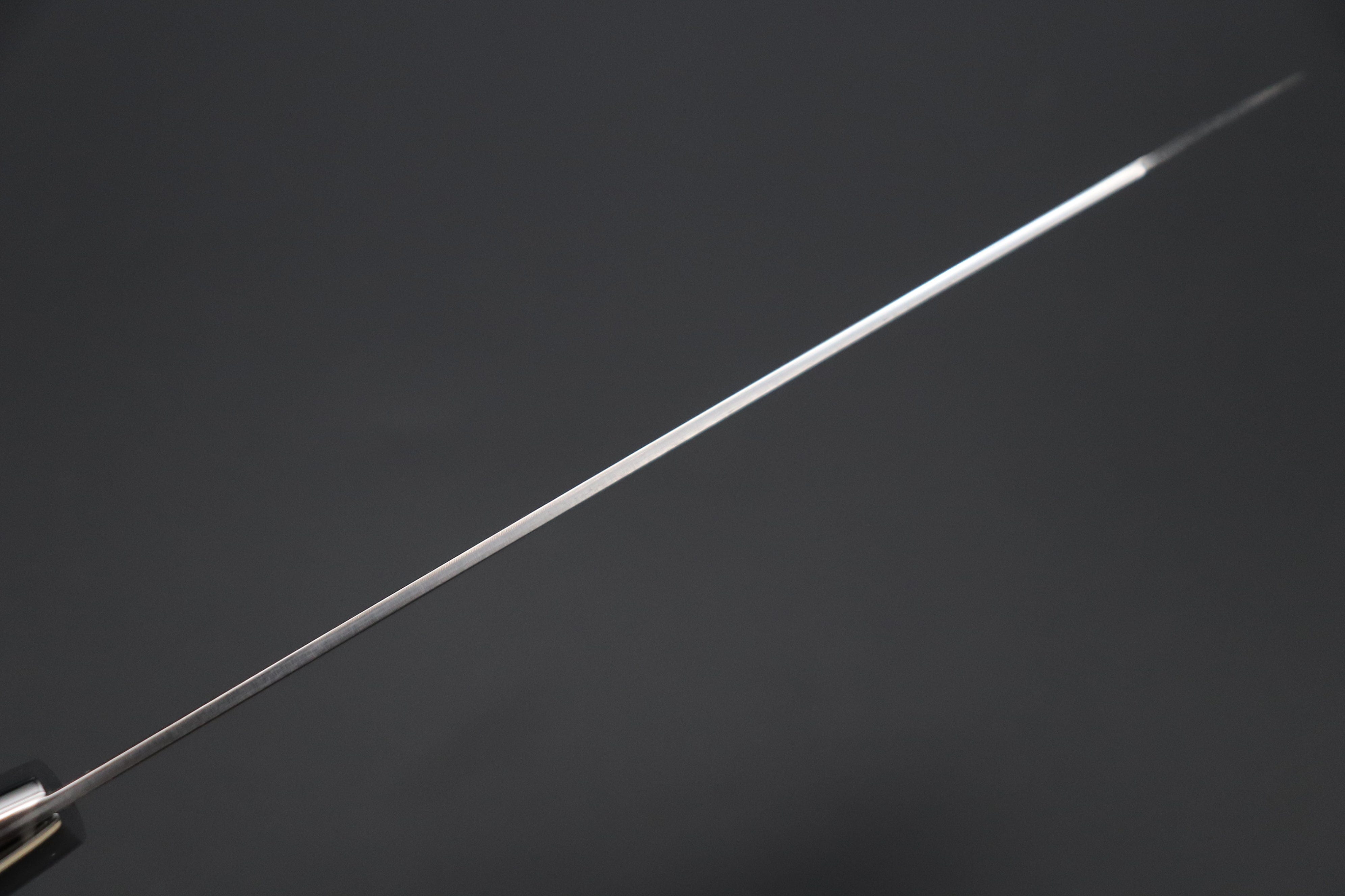 Takeshi Saji is a very well respected Master Smith, who specializes in making traditional hammer forged Japanese knives. We are often surprised by the variety of ideas he has and the very distinctive materials and rare steel that he uses for his custom knives.