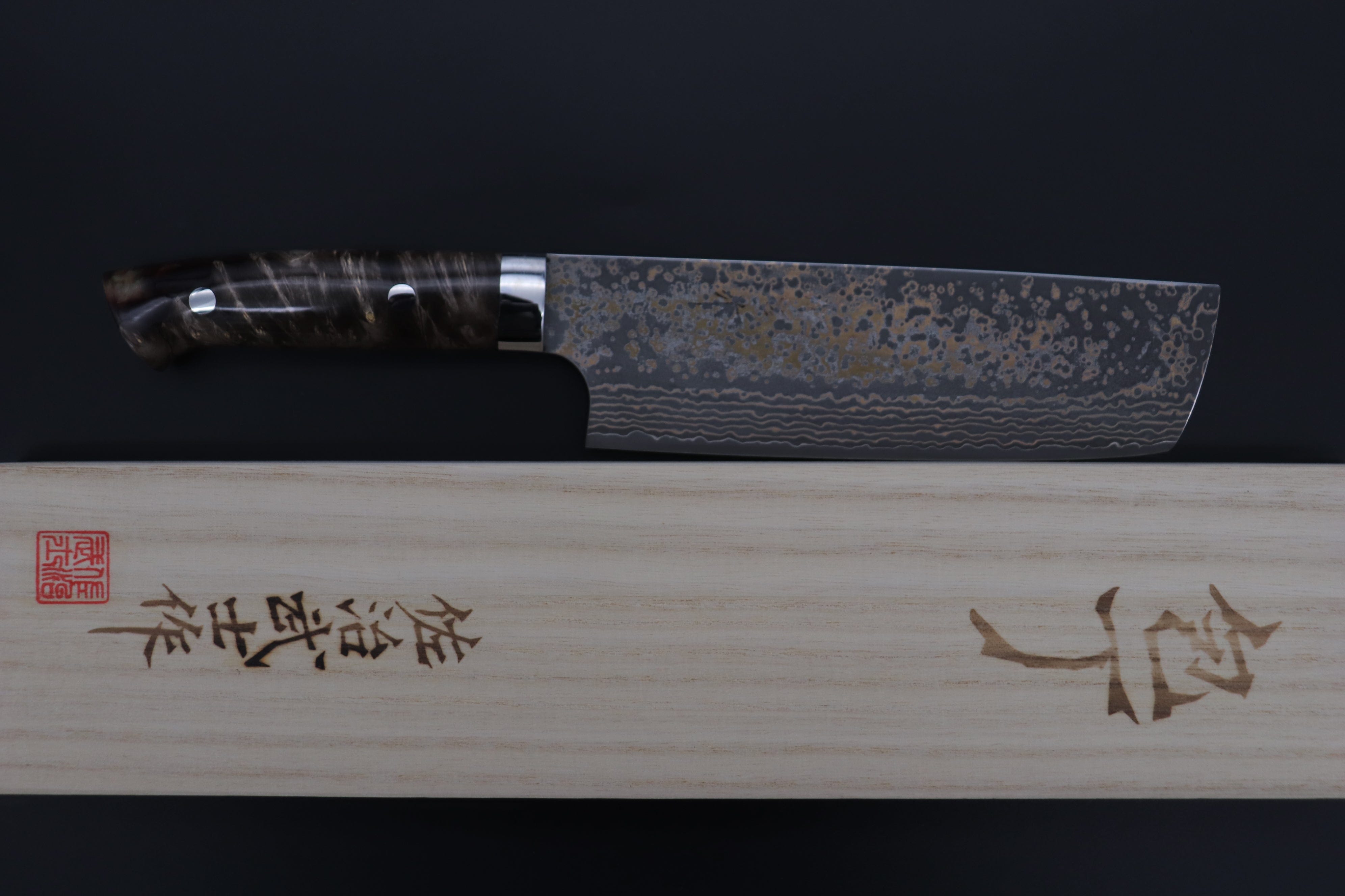 One day at the US Knife Show, we accidentaly met with this beautiful Natural Wood & Metallic Brown Color stabilized Hybrid wood material. We promptly requested Master Saji to use this special wood for his very limited edition knife and now another masterpiece of Saji SUMMIT- Limited Edition Custom Series knife is available.