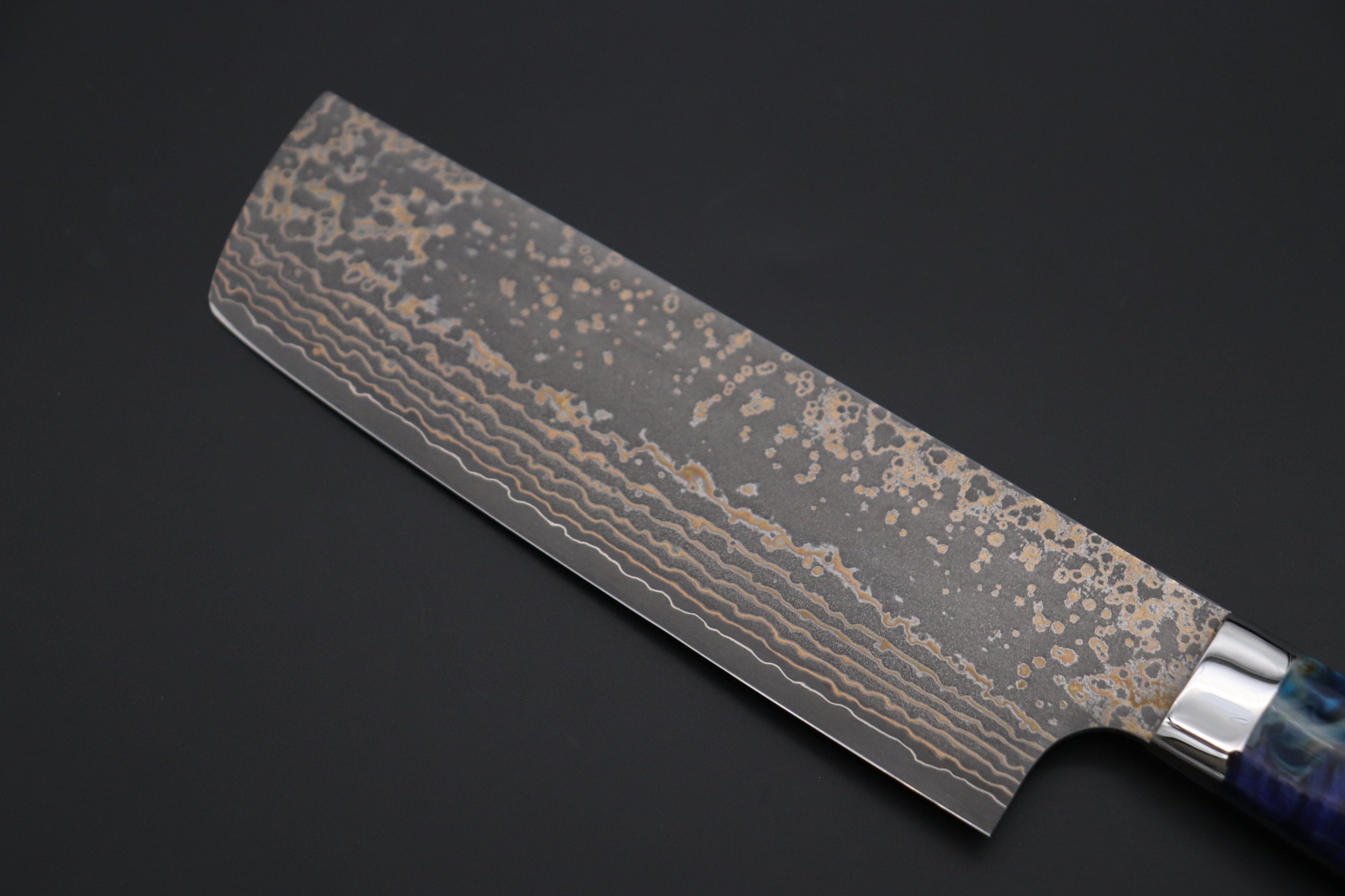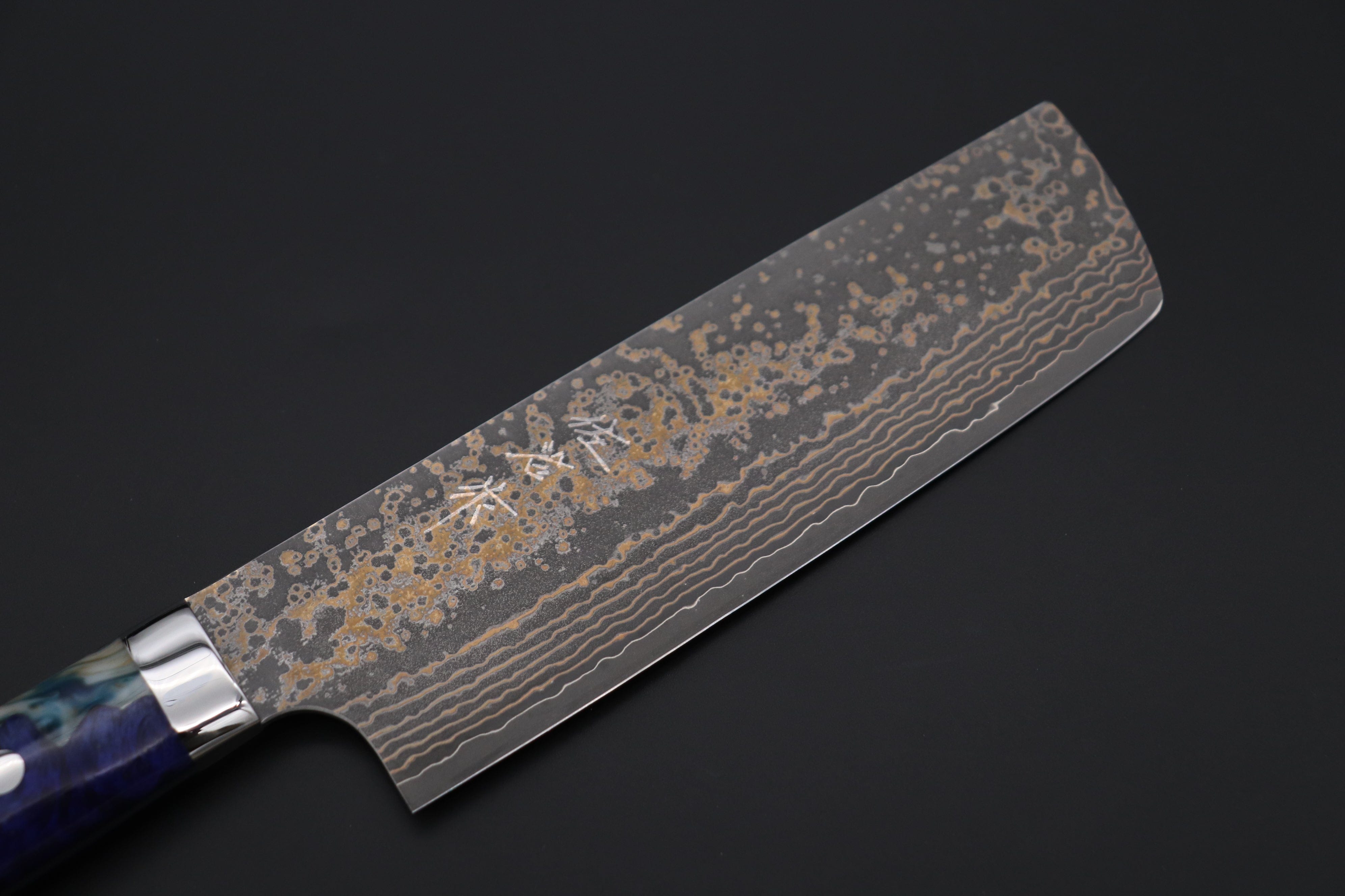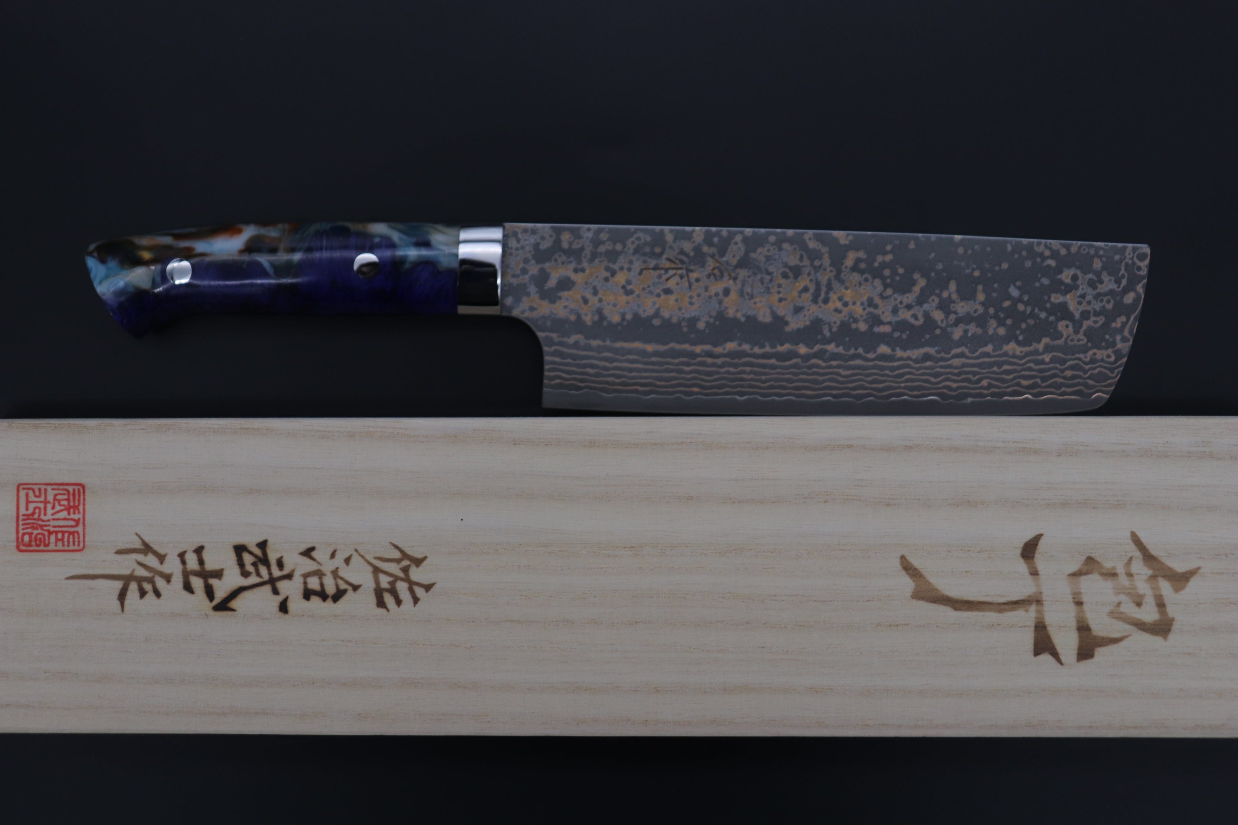Knife Model: Takeshi Saji SUMMIT ― Limited Edition Custom Series SMT-1085 VG-10W Multi-Colored Golden-Rainbow Damascus Nakiri 165mm
