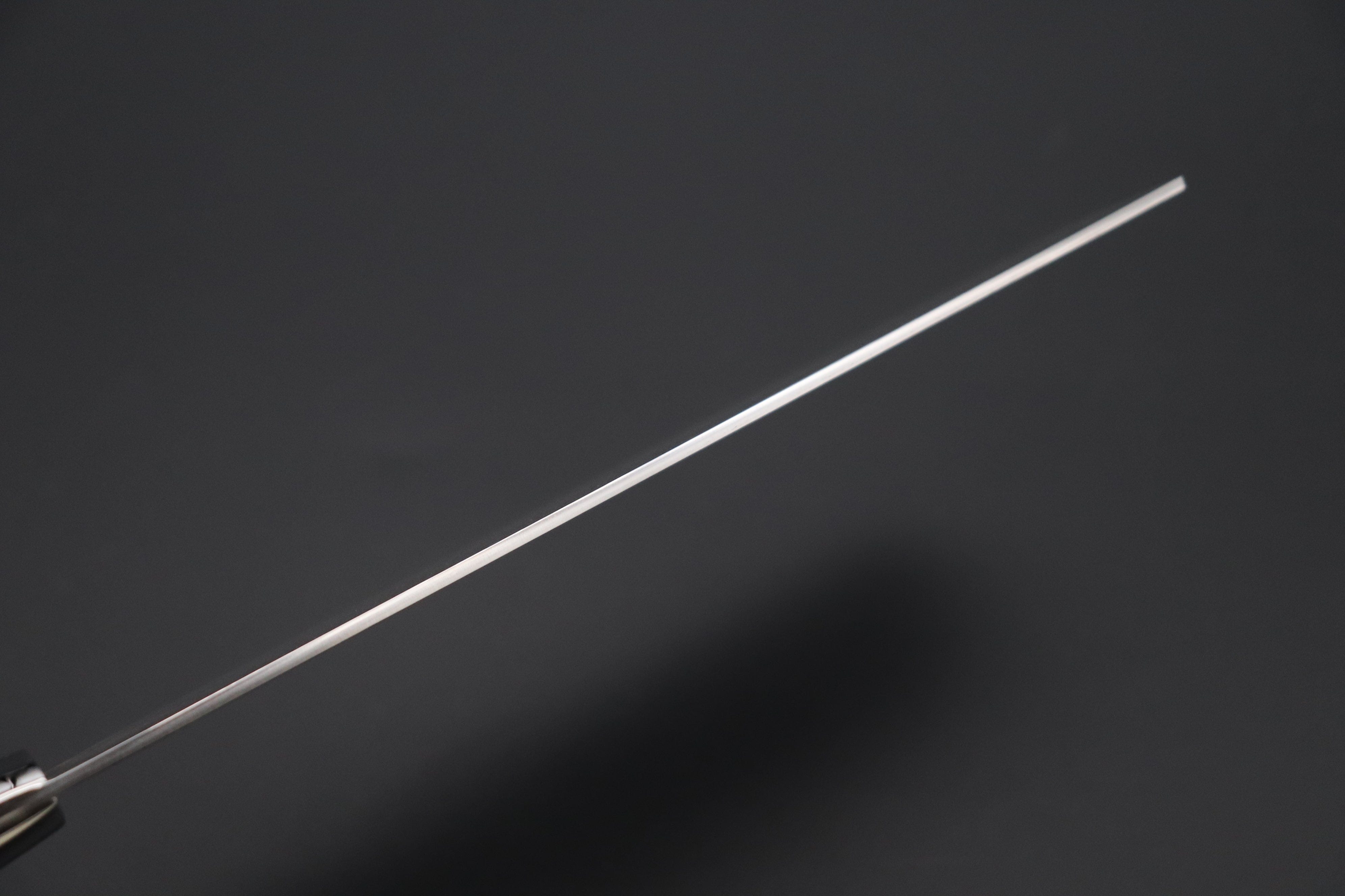 Takeshi Saji is a very well respected Master Smith, who specializes in making traditional hammer forged Japanese knives. We are often surprised by the variety of ideas he has and the very distinctive materials and rare steel that he uses for his custom knives.