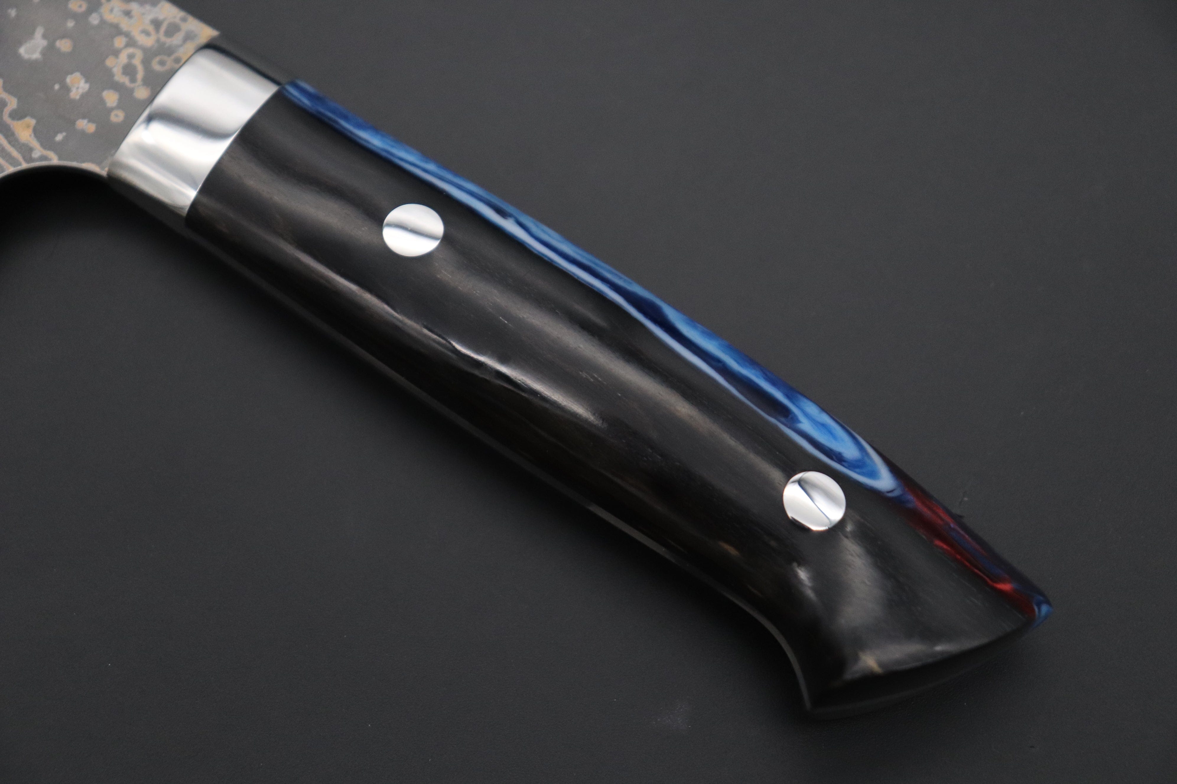 Takeshi Saji is a very well respected Master Smith, who specializes in making traditional hammer forged Japanese knives. We are often surprised by the variety of ideas he has and the very distinctive materials and rare steel that he uses for his custom knives.