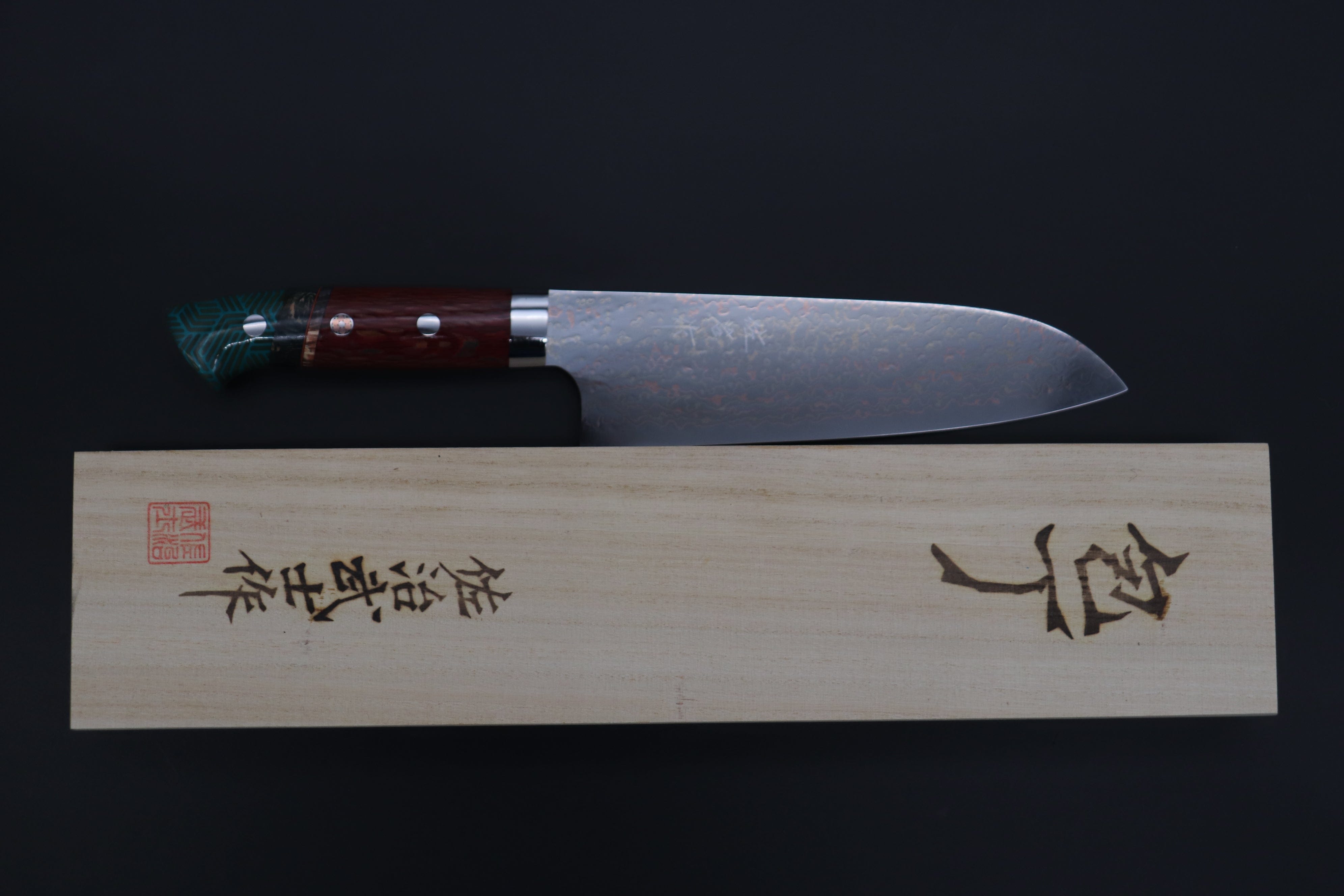 Knife Model: Takeshi Saji SUMMIT ― Limited Edition Custom Series SMT-1116 VG-10W磨 Multi-Colored Golden-Rainbow Damascus Santoku 180mm