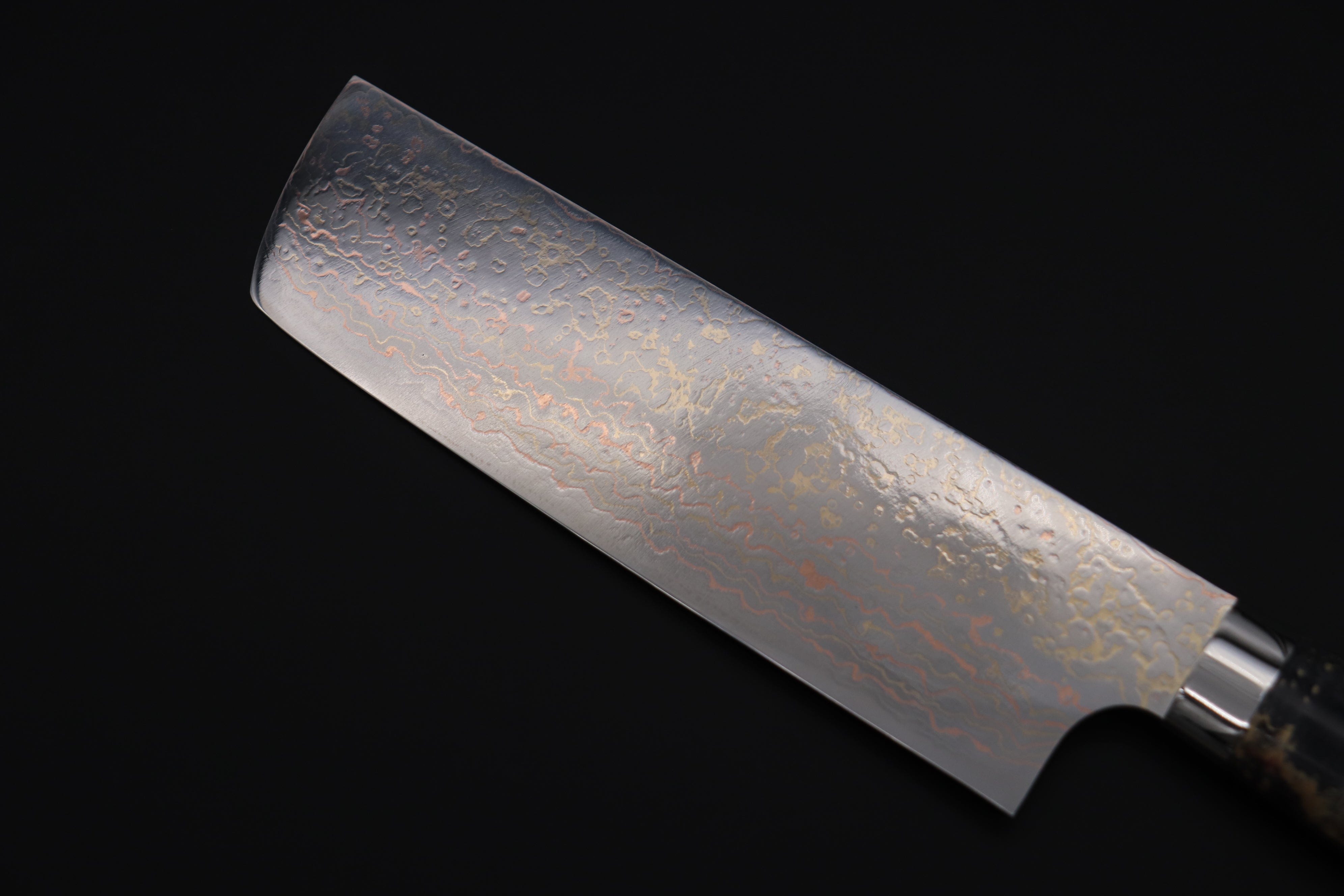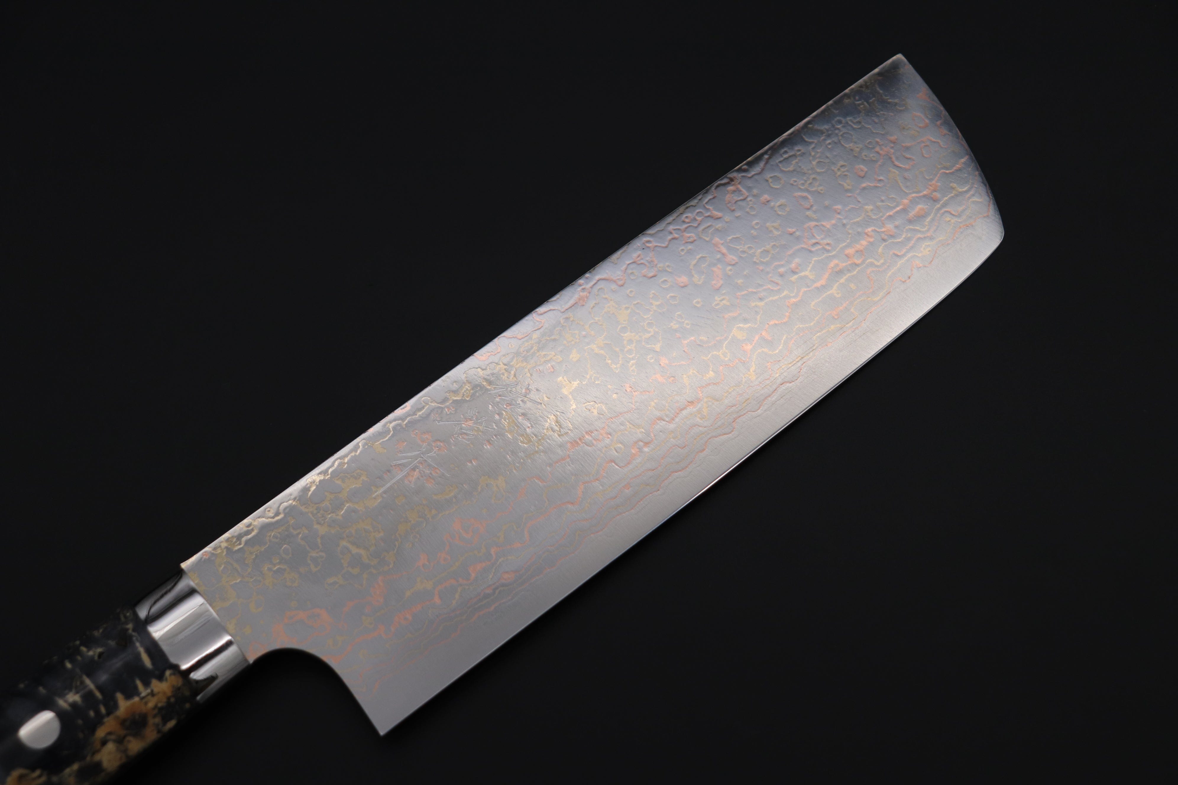 Knife Model: Takeshi Saji SUMMIT ― Limited Edition Custom Series SMT-1124 VG-10W Multi-Colored Golden-Rainbow Damascus Nakiri 165mm