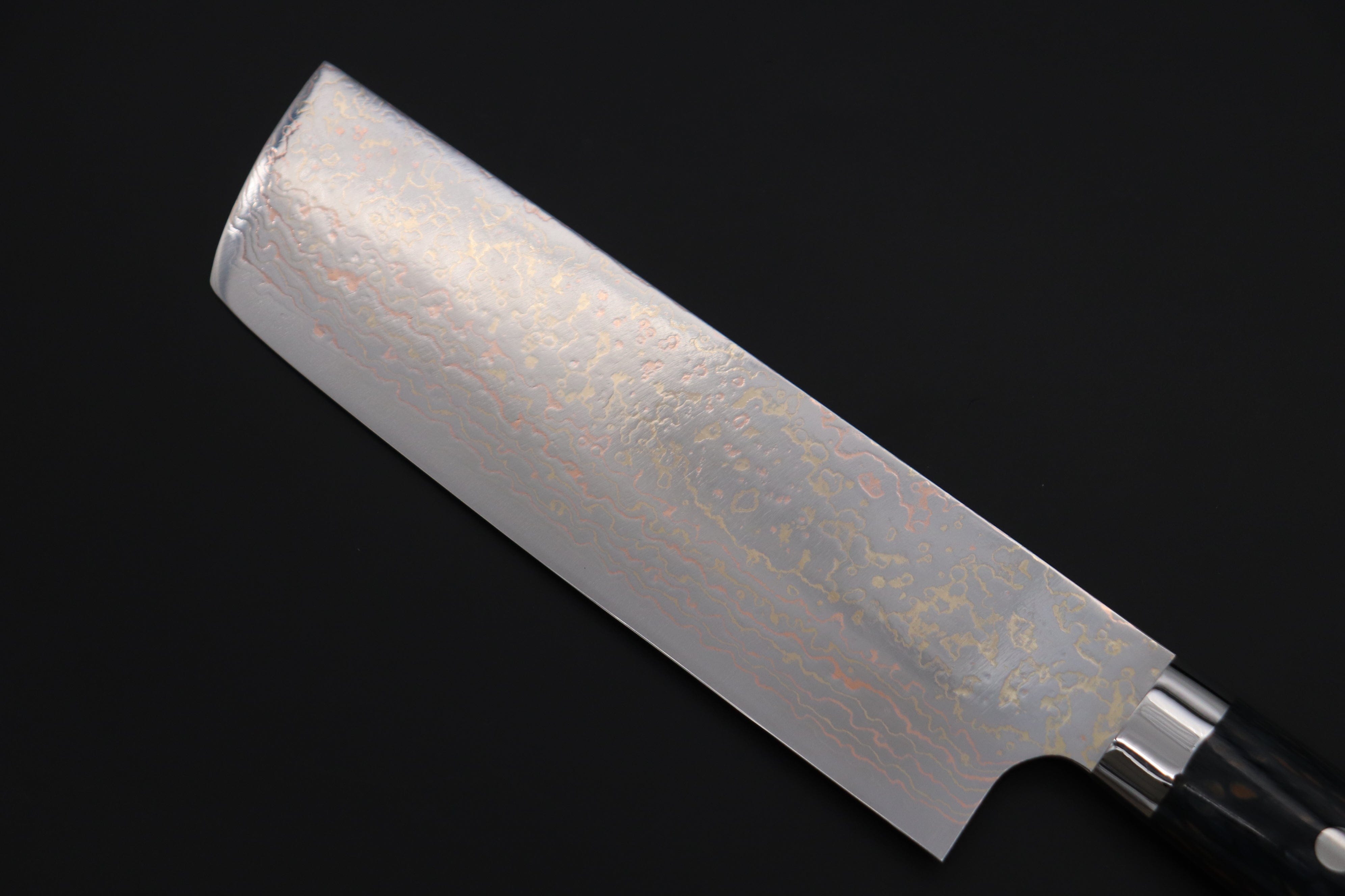 Master Saji has just completed a fresh new batch of traditional hammer forged custom kitchen knives that, once again, feature his unique multi-colored and beautiful polished Damascus. The blades have a core of VG-10W Cobalt-Tungsten Stainless steel (HR.c 61 to 62), which has been clad with multiple layers of rust-resistant stainless steel, brass and copper.