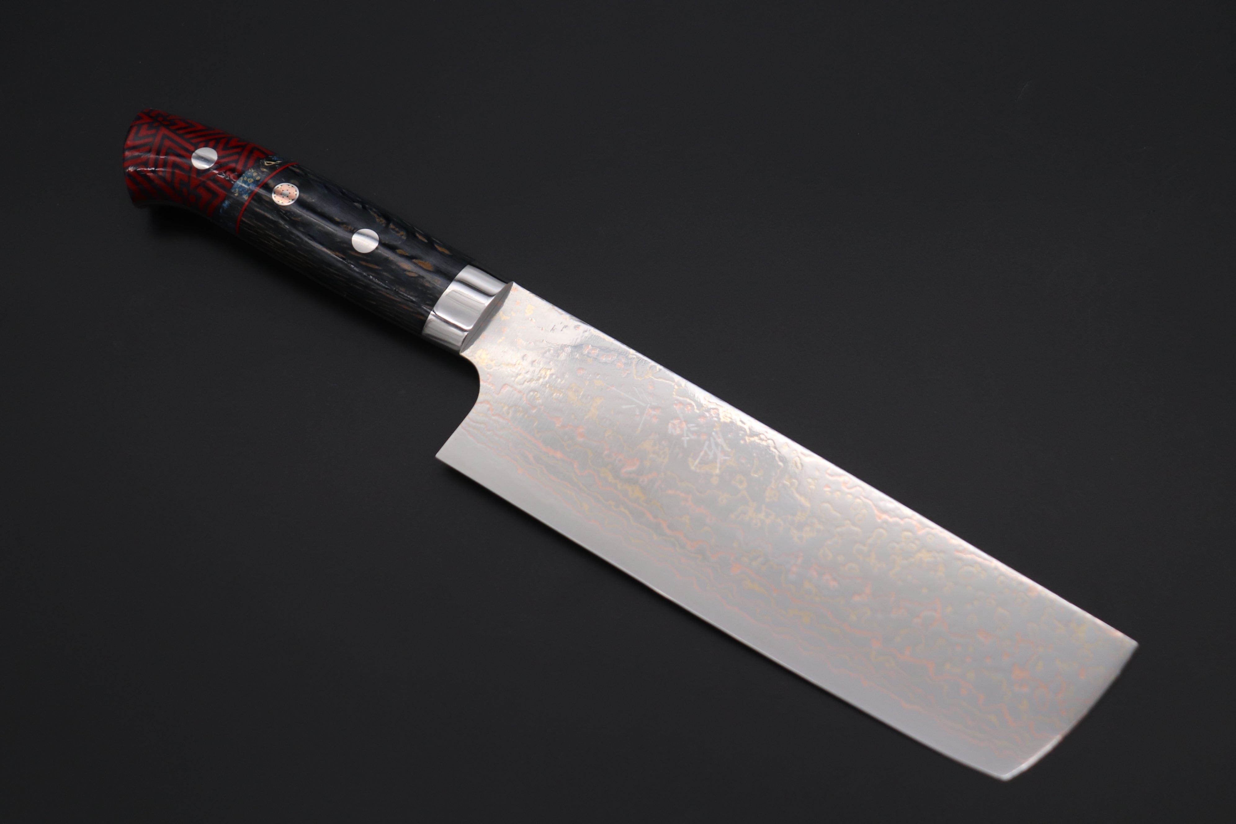 Knife Model: Takeshi Saji SUMMIT ― Limited Edition Custom Series SMT-1125 VG-10W Multi-Colored Golden-Rainbow Damascus Nakiri 165mm