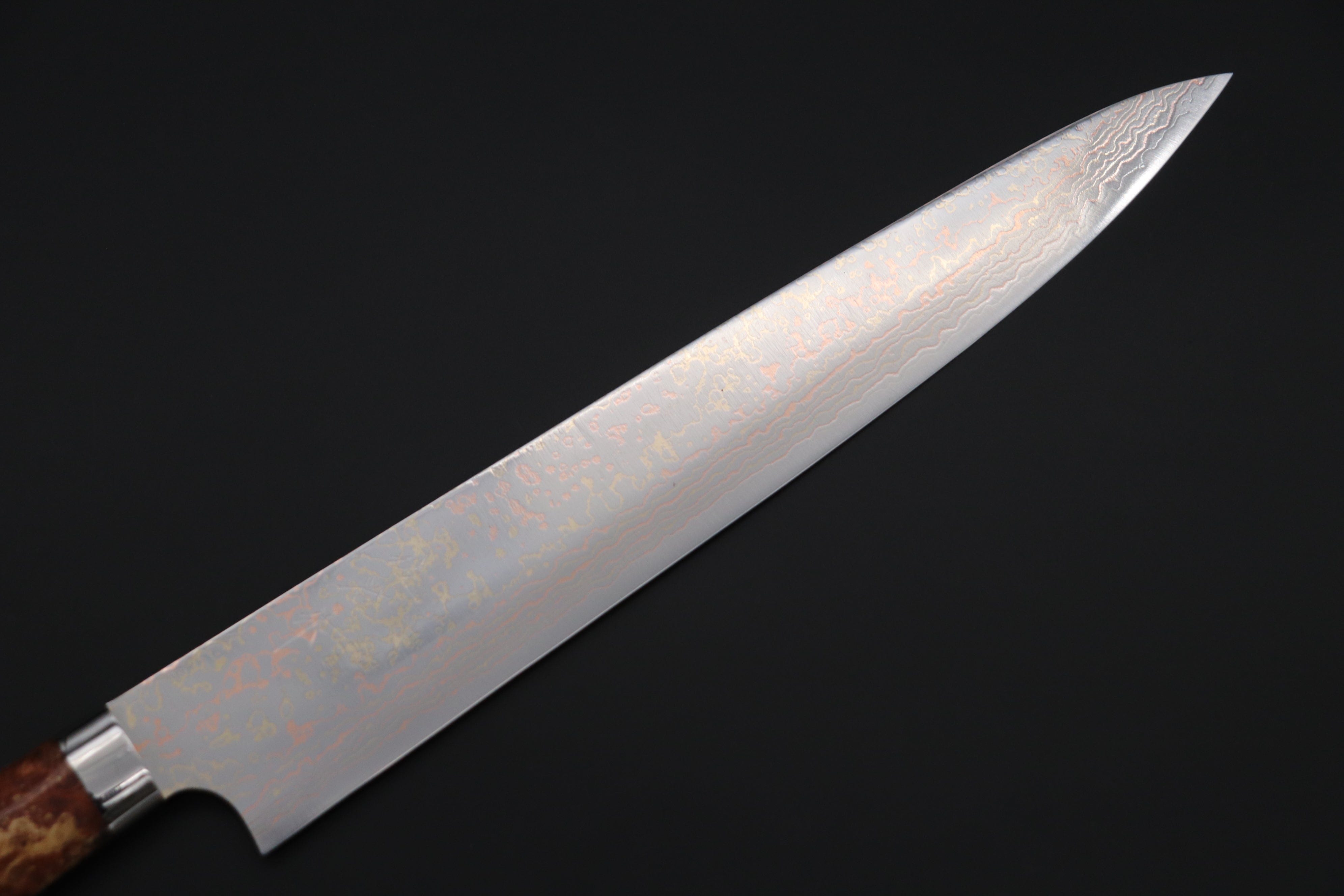 Knife Model: Takeshi Saji SUMMIT ― Limited Edition Custom Series SMT-1136 VG-10W Multi-Colored Golden-Rainbow Damascus Sujihiki 270mm