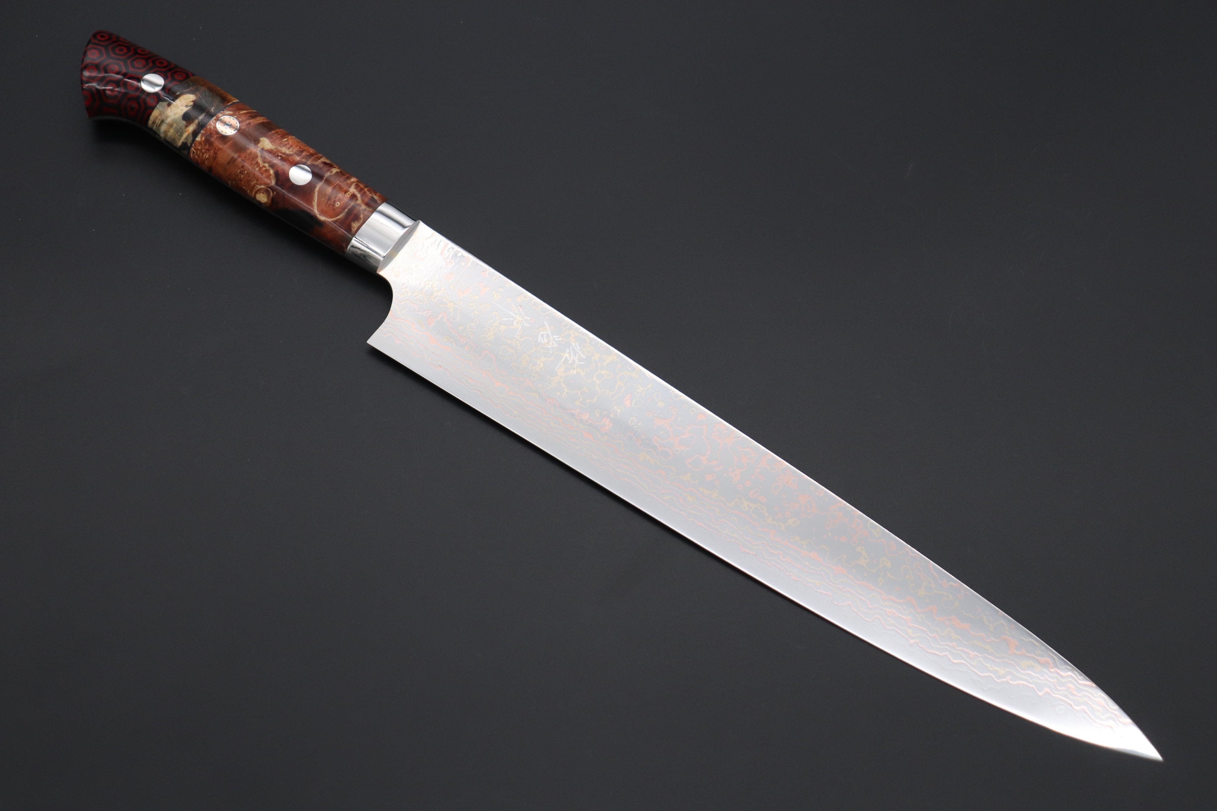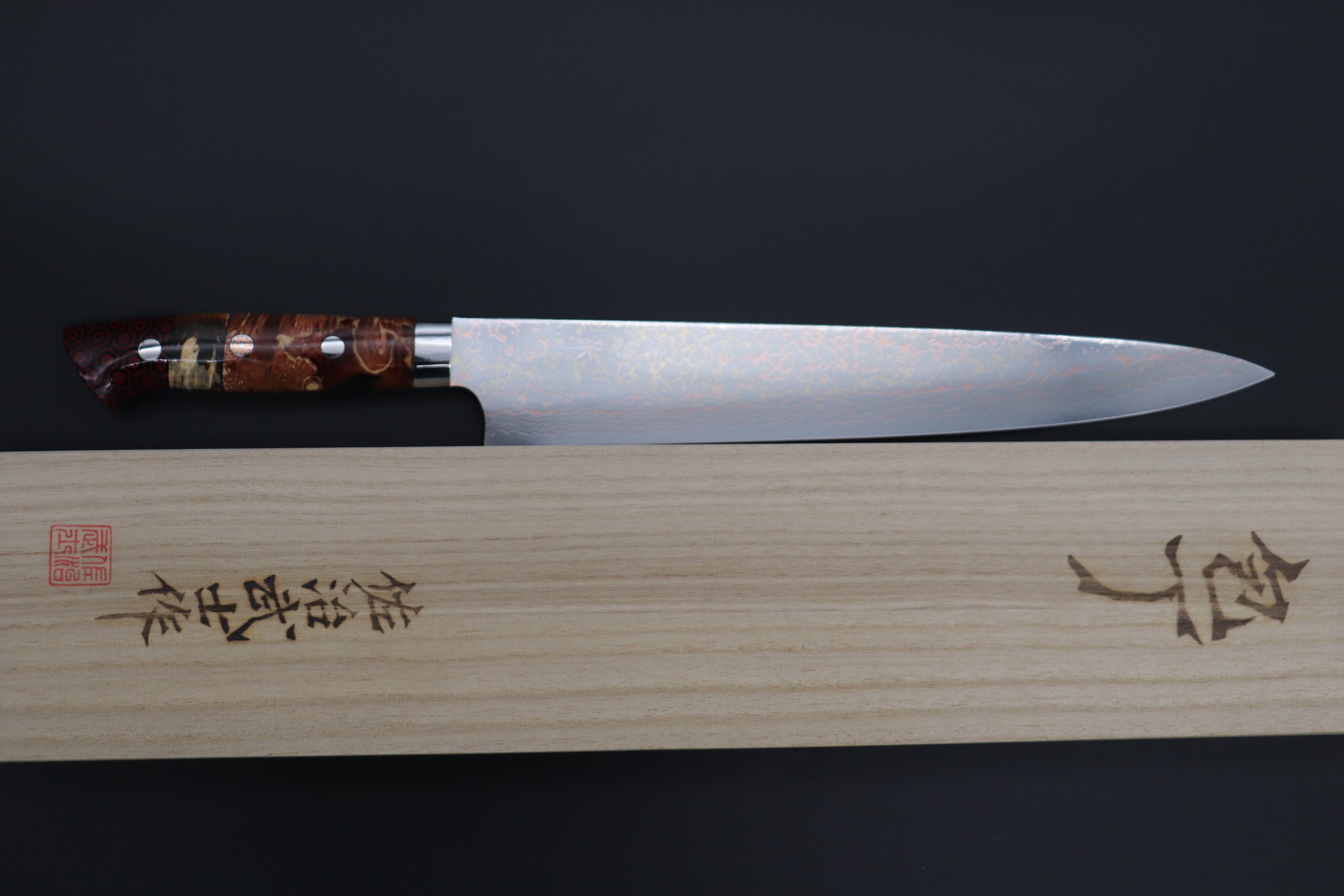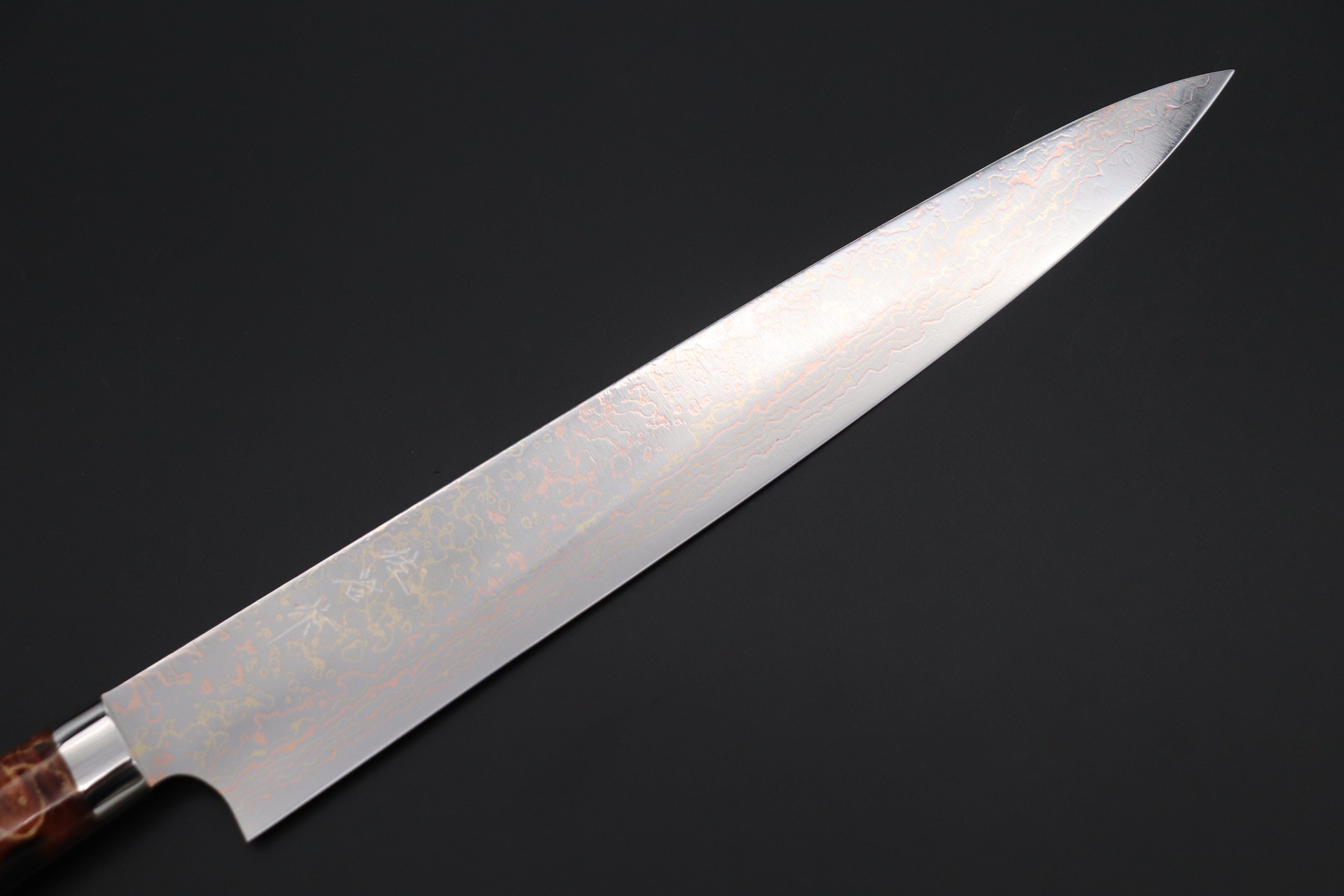 Knife Model: Takeshi Saji SUMMIT ― Limited Edition Custom Series SMT-1137 VG-10W Multi-Colored Golden-Rainbow Damascus Sujihiki 270mm