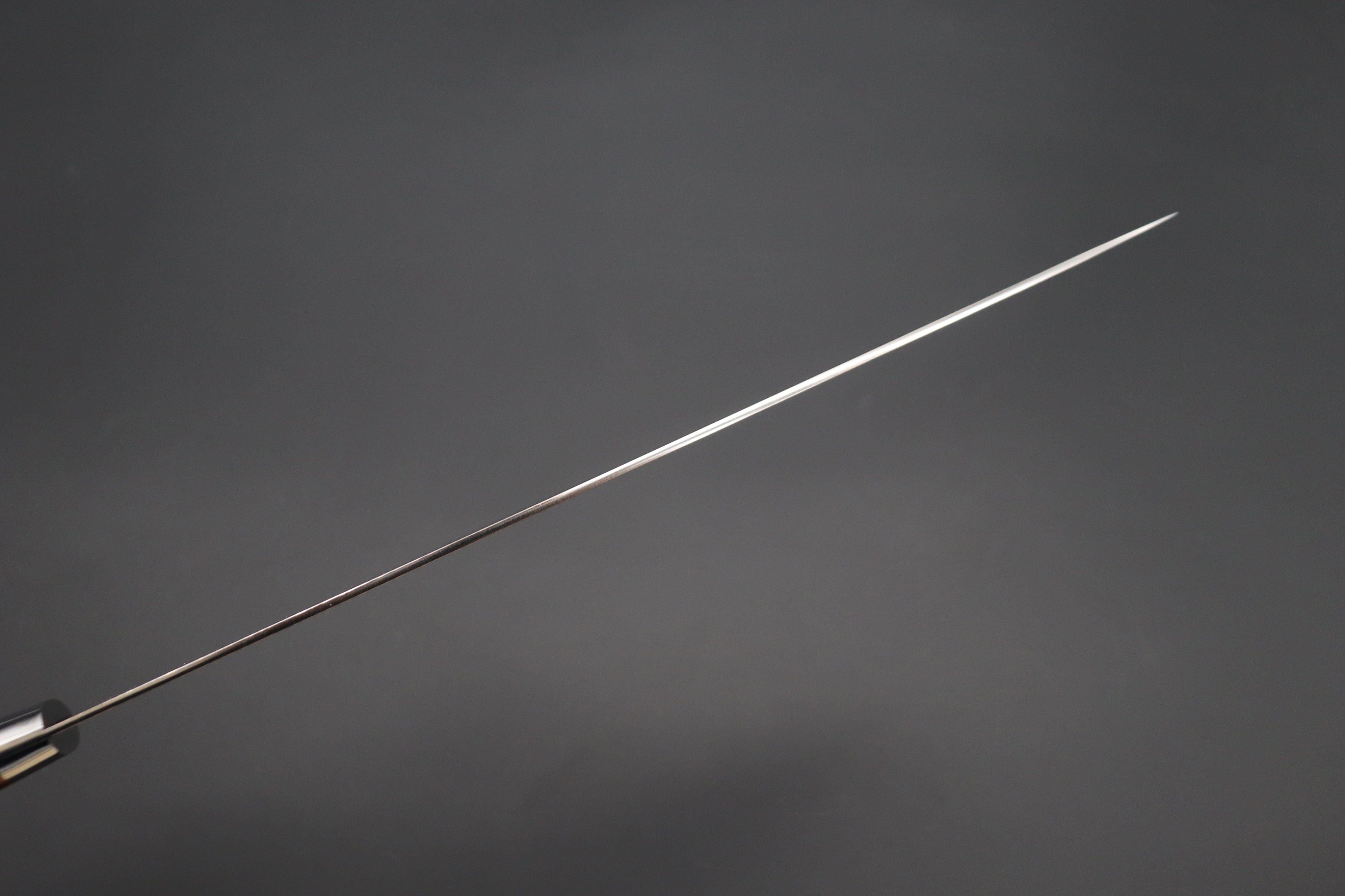 The long, narrow, graceful blade of the Sujihiki is particularly useful for trimming away sinew and fat from meat, finely slicing meat or boneless fish, or for filleting and skinning fish. The long blade allows the meat or fish to be cut in one single drawing motion, from heel to tip.