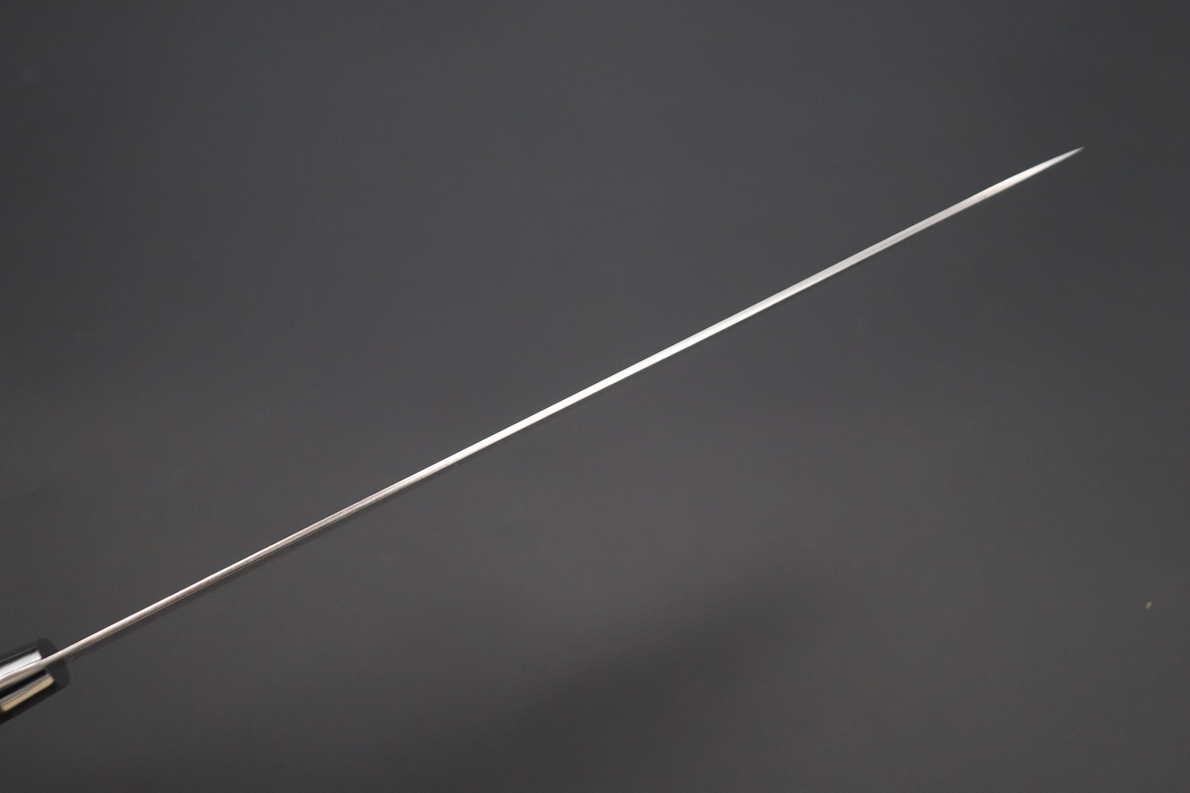 The long, narrow, graceful blade of the Sujihiki is particularly useful for trimming away sinew and fat from meat, finely slicing meat or boneless fish, or for filleting and skinning fish. The long blade allows the meat or fish to be cut in one single drawing motion, from heel to tip.