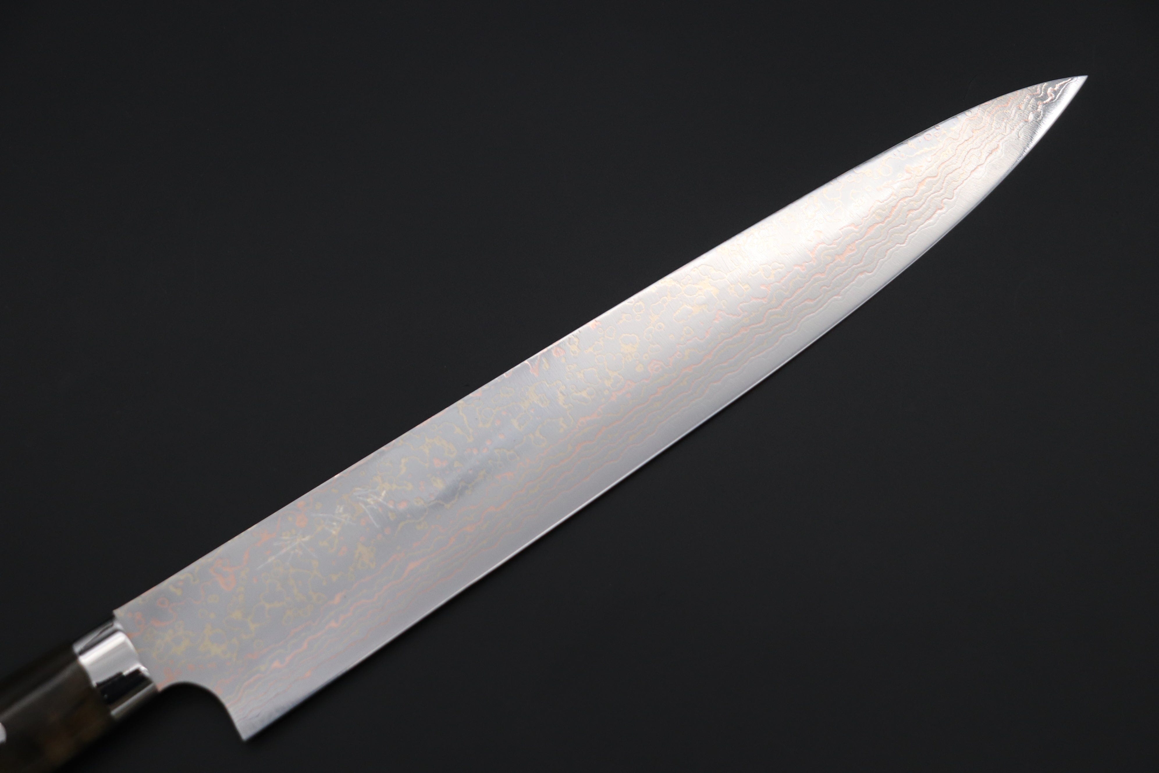 Knife Model: Takeshi Saji SUMMIT ― Limited Edition Custom Series SMT-1138 VG-10W Multi-Colored Golden-Rainbow Damascus Sujihiki 270mm