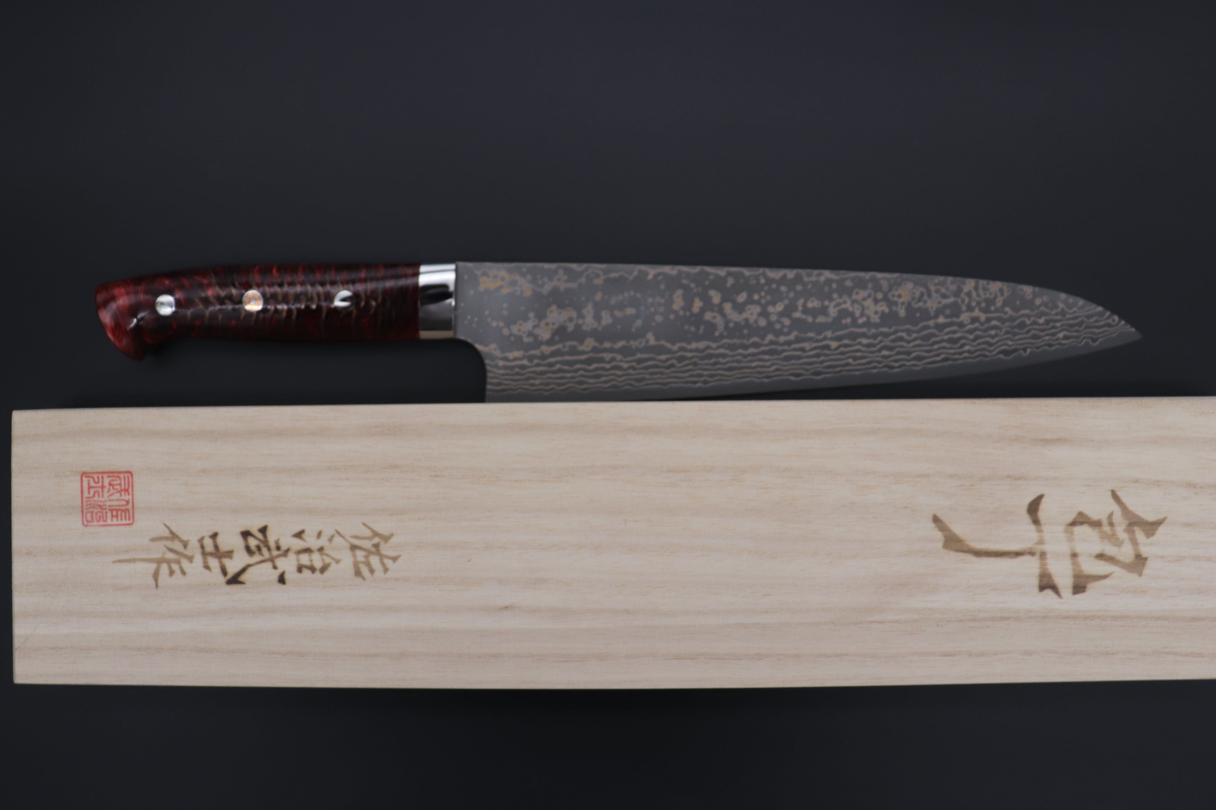 Knife Model: Takeshi Saji SUMMIT ― Limited Edition Custom Series SMT-970 VG-10W Multi-Colored Golden-Rainbow Damascus Gyuto 240mm