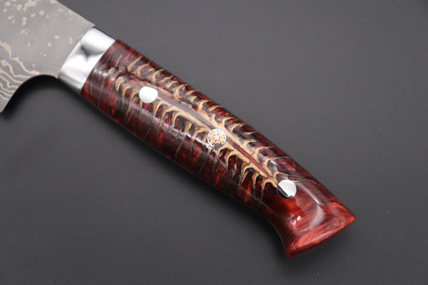 Takeshi Saji's Custom Handmade "Stabilized Spruce Cones Hybrid Wood Handle" perfectly complements the Beautiful and Wild Custom Damascus Blade. This handle blends the allure of spruce cones with durability and ergonomic design.