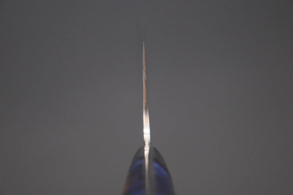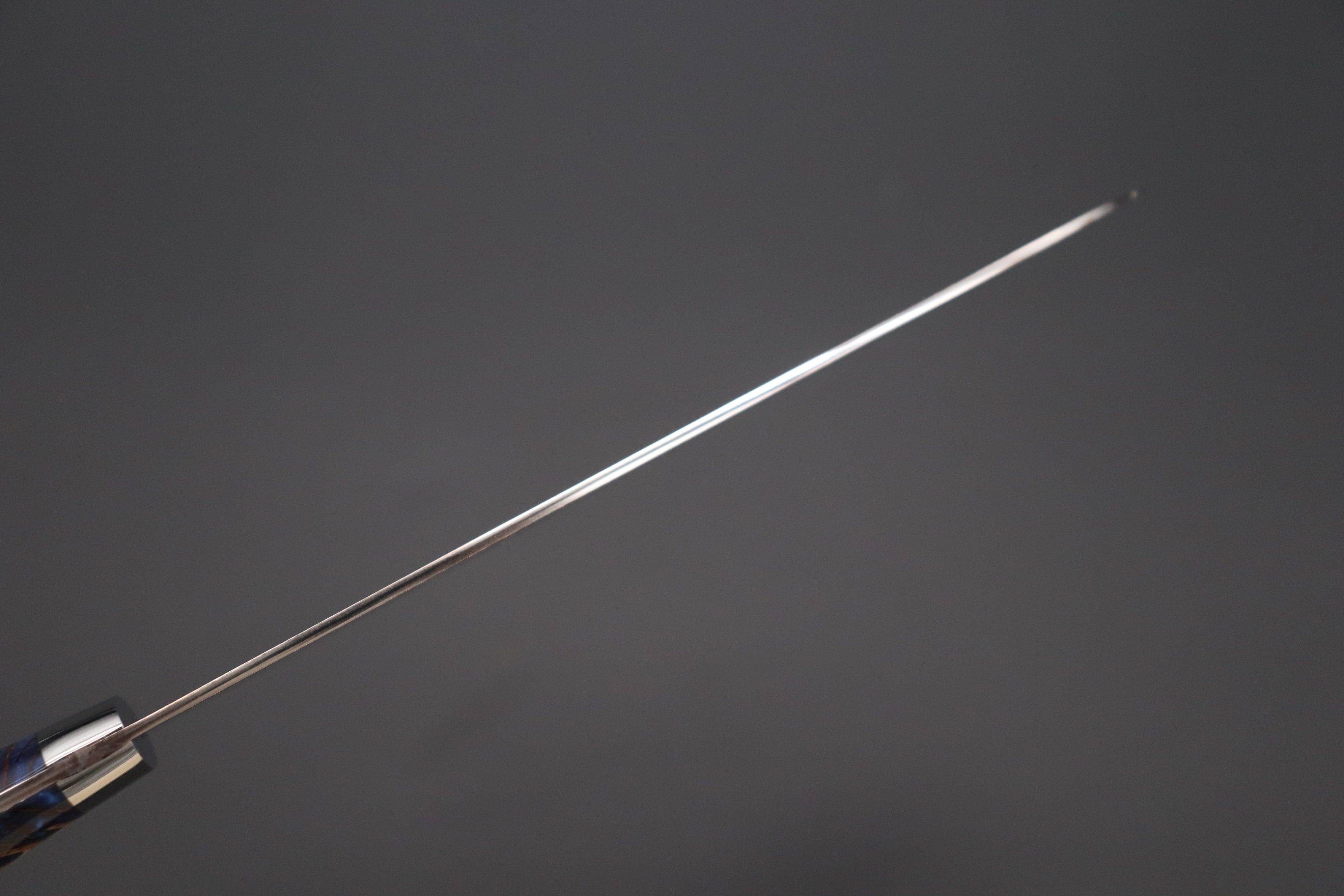 Master Saji has just completed a fresh new batch of traditional hammer forged custom kitchen knives that, once again, feature his unique multi-colored and beautiful polished Damascus. The blades have a core of VG-10W Cobalt-Tungsten Stainless steel (HR.c 61 to 62), which has been clad with multiple layers of rust-resistant stainless steel, brass and copper.
