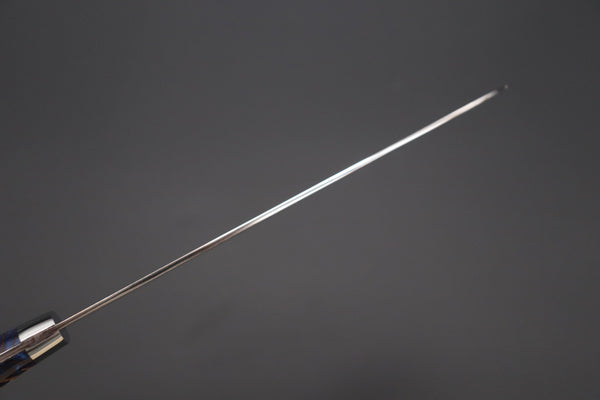 Takeshi Saji is a very well respected Master Smith, who specializes in making traditional hammer forged Japanese knives. We are often surprised by the variety of ideas he has and the very distinctive materials and rare steel that he uses for his custom knives.