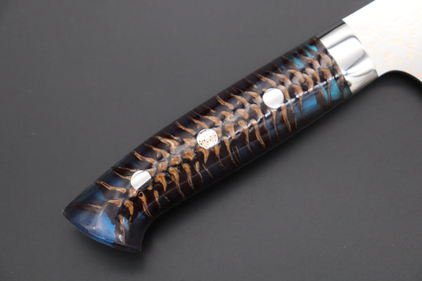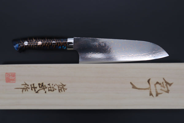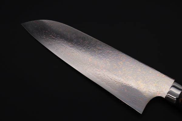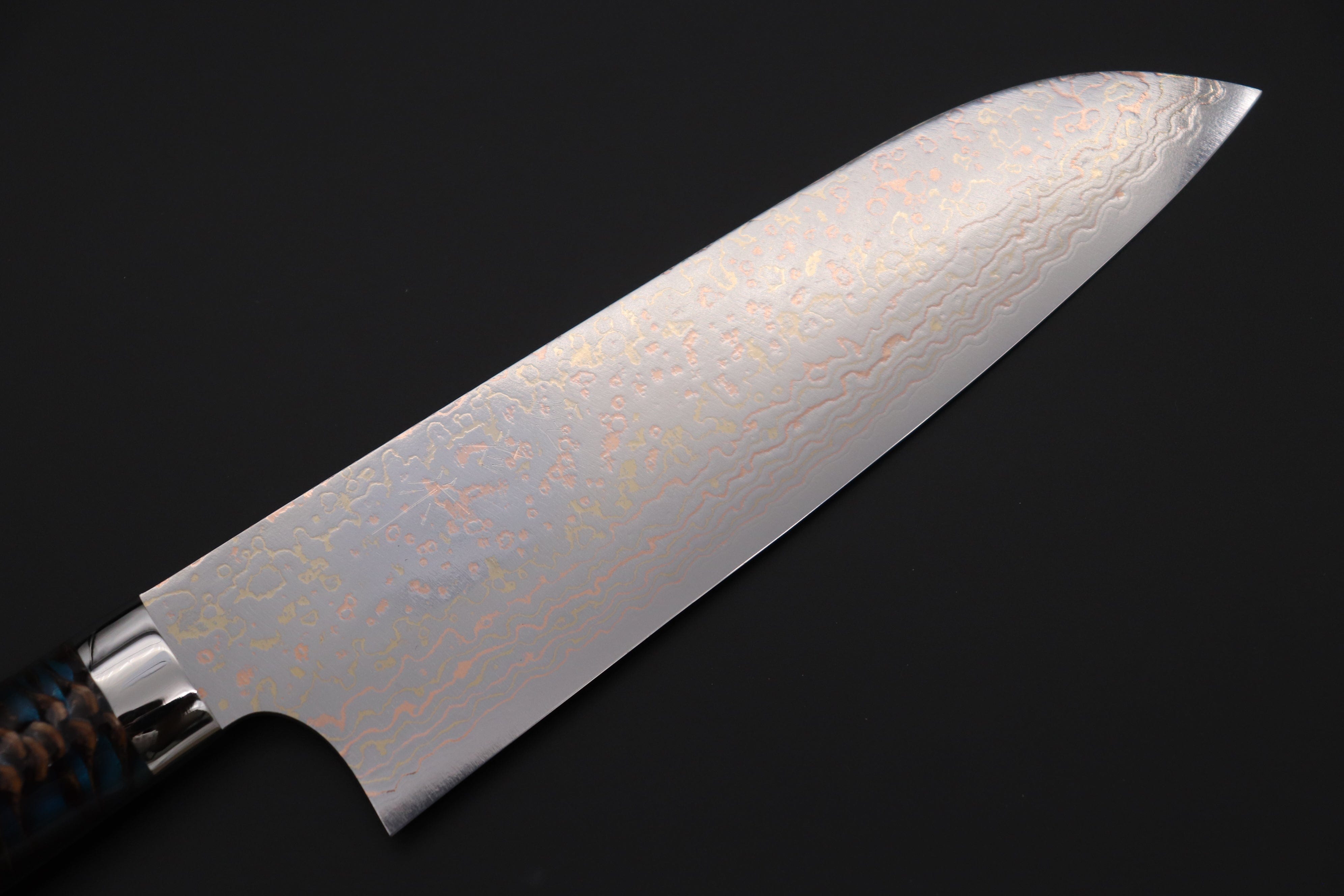 Knife Model: Takeshi Saji SUMMIT ― Limited Edition Custom Series SMT-979 VG-10W Multi-Colored Golden-Rainbow Damascus Santoku 175mm