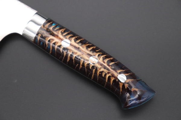 Takeshi Saji's Custom Handmade "Stabilized Spruce Cones Hybrid Wood Handle" perfectly complements the Beautiful and Wild Custom Damascus Blade. This handle blends the allure of spruce cones with durability and ergonomic design.