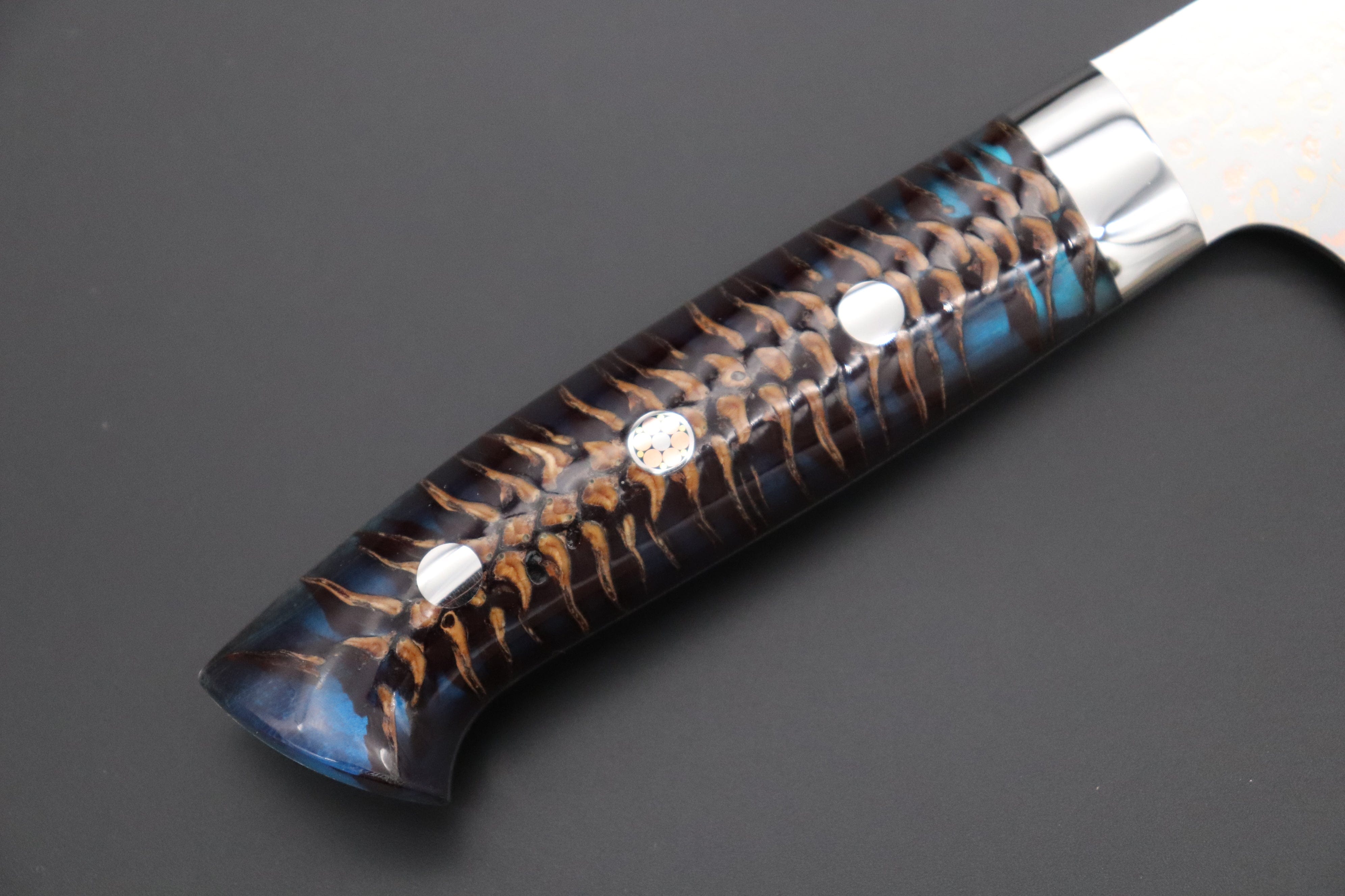 Master Saji has just completed a fresh new batch of traditional hammer forged custom kitchen knives that, once again, feature his unique multi-colored and beautiful polished Damascus. The blades have a core of VG-10W Cobalt-Tungsten Stainless steel (HR.c 61 to 62), which has been clad with multiple layers of rust-resistant stainless steel, brass and copper.