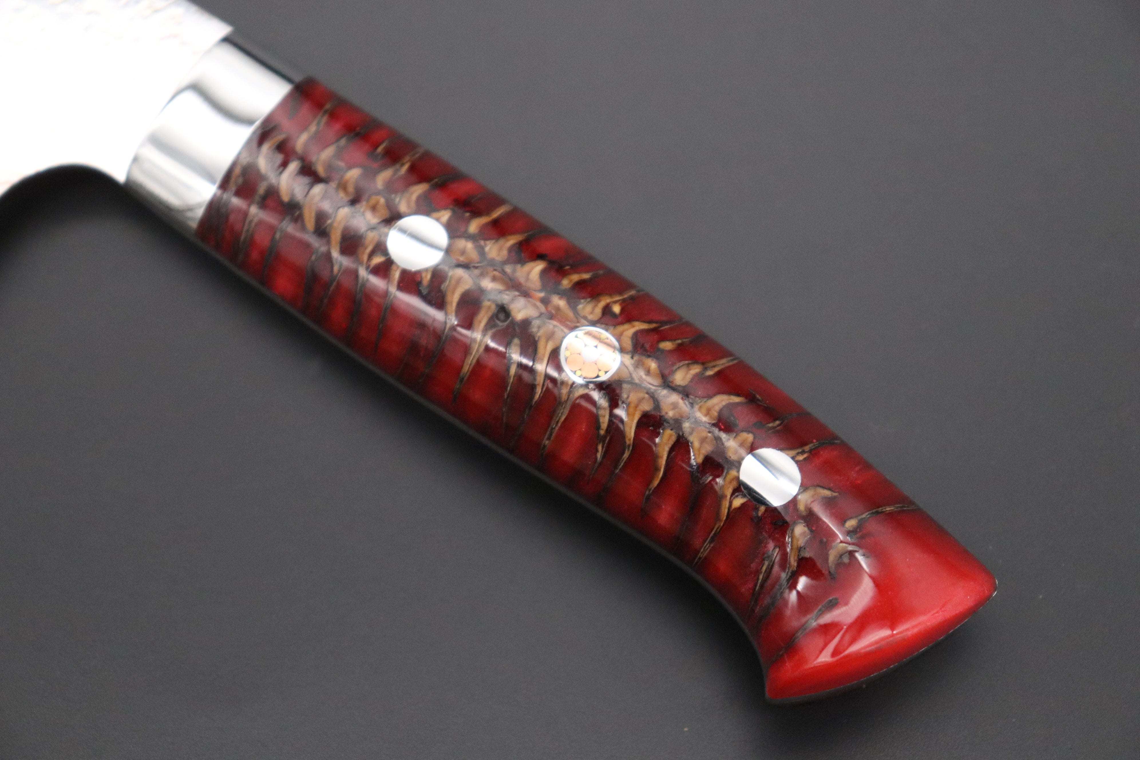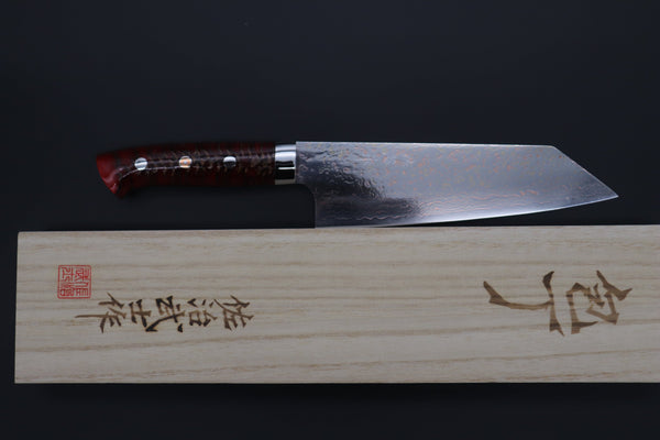 Master Saji has just completed a fresh new batch of traditional hammer forged custom kitchen knives that, once again, feature his unique multi-colored and beautiful polished Damascus. The blades have a core of VG-10W Cobalt-Tungsten Stainless steel (HR.c 61 to 62), which has been clad with multiple layers of rust-resistant stainless steel, brass and copper.