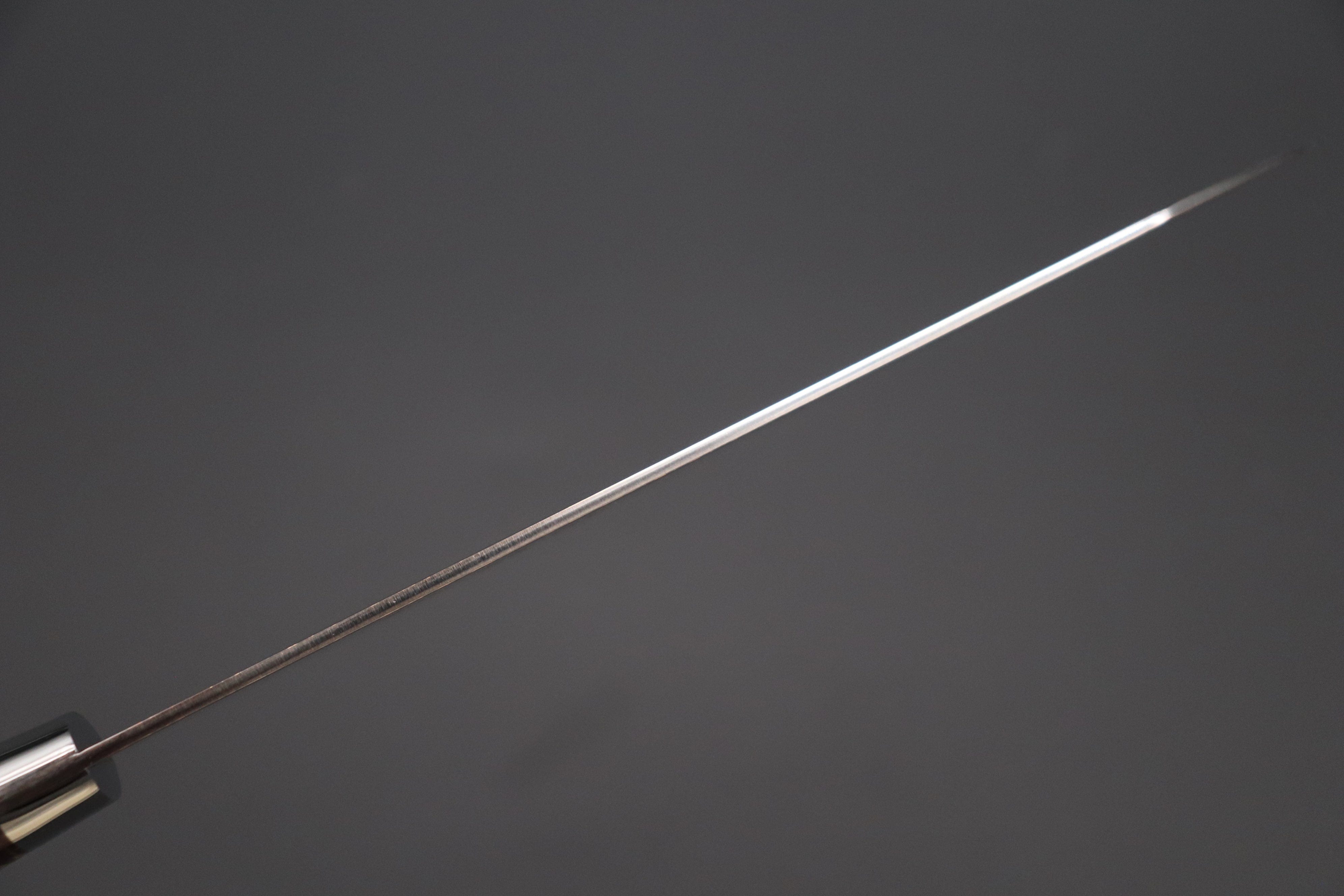 Takeshi Saji is a very well respected Master Smith, who specializes in making traditional hammer forged Japanese knives. We are often surprised by the variety of ideas he has and the very distinctive materials and rare steel that he uses for his custom knives.