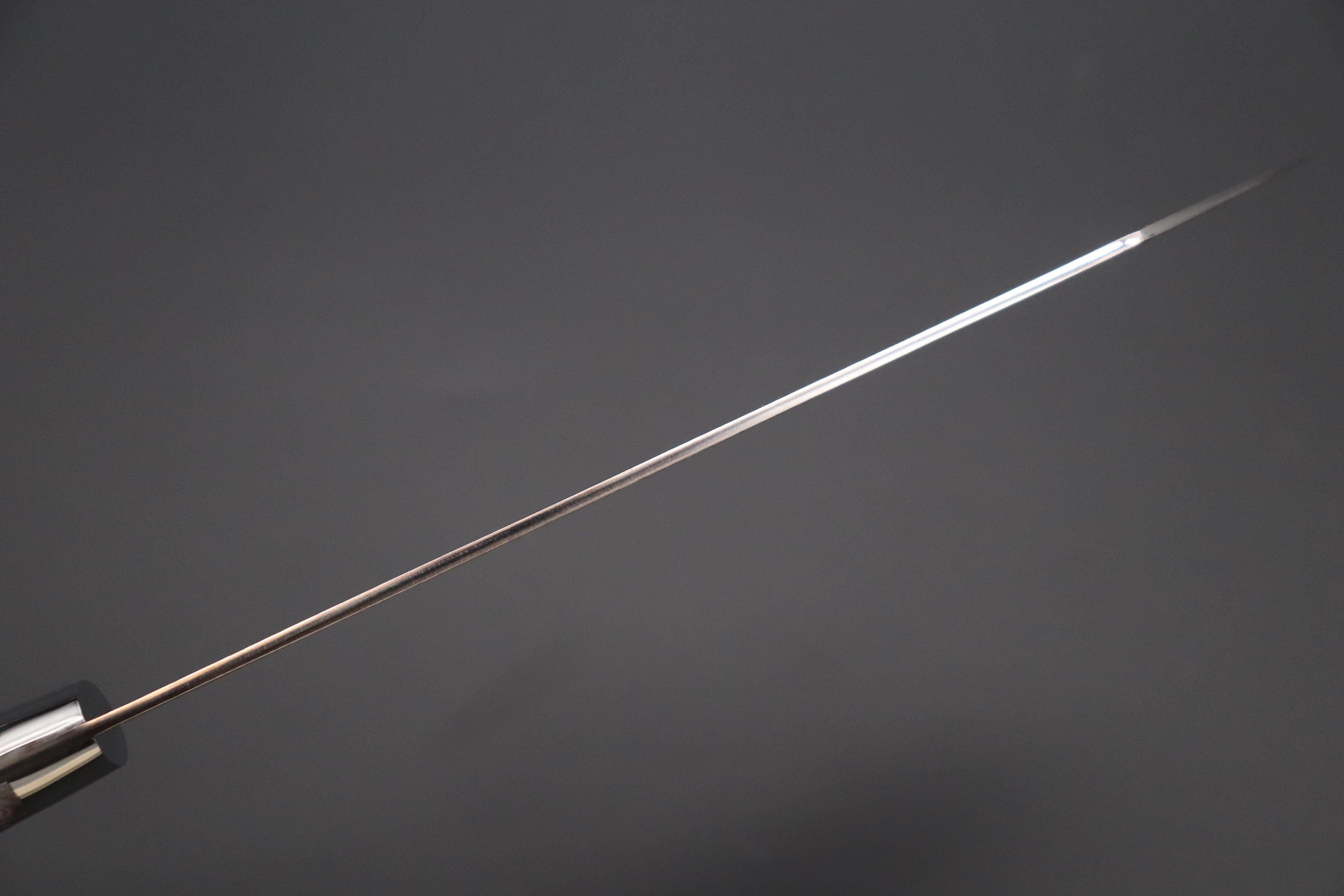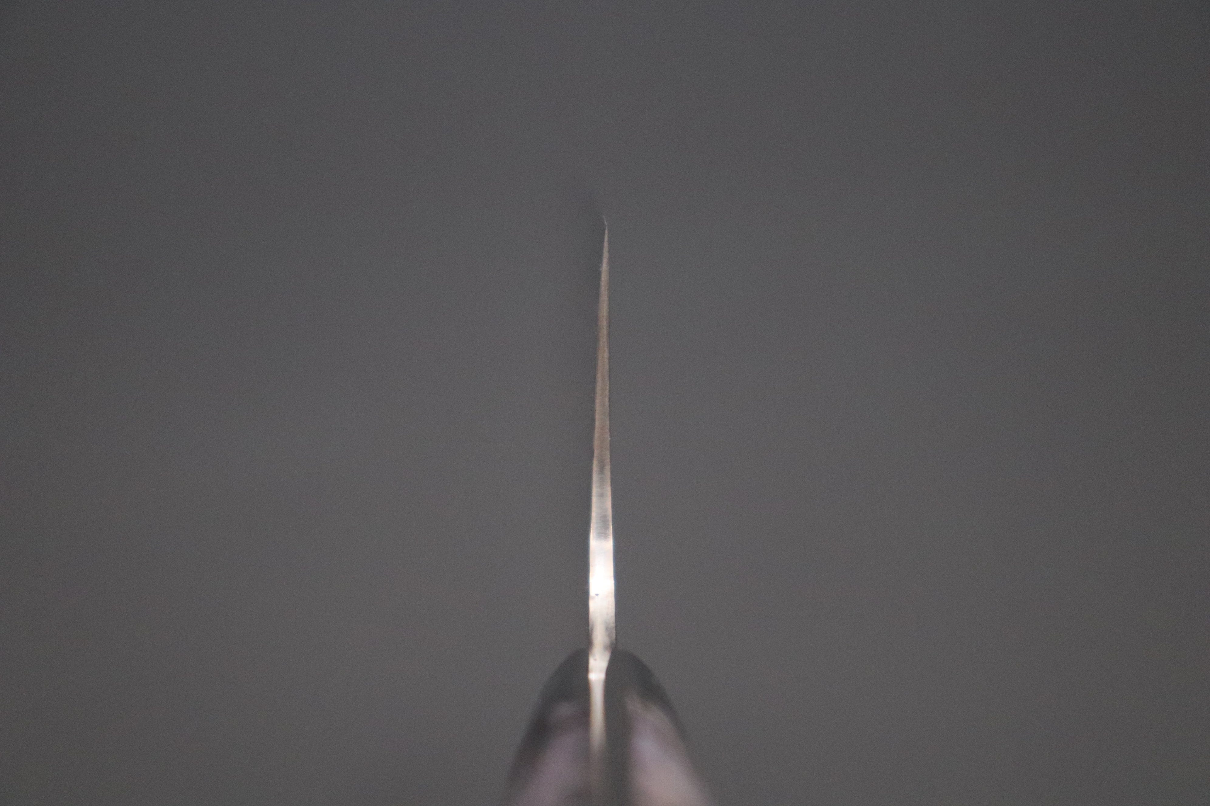 Takeshi Saji is a very well respected Master Smith, who specializes in making traditional hammer forged Japanese knives. We are often surprised by the variety of ideas he has and the very distinctive materials and rare steel that he uses for his custom knives.