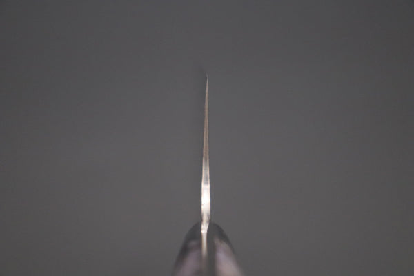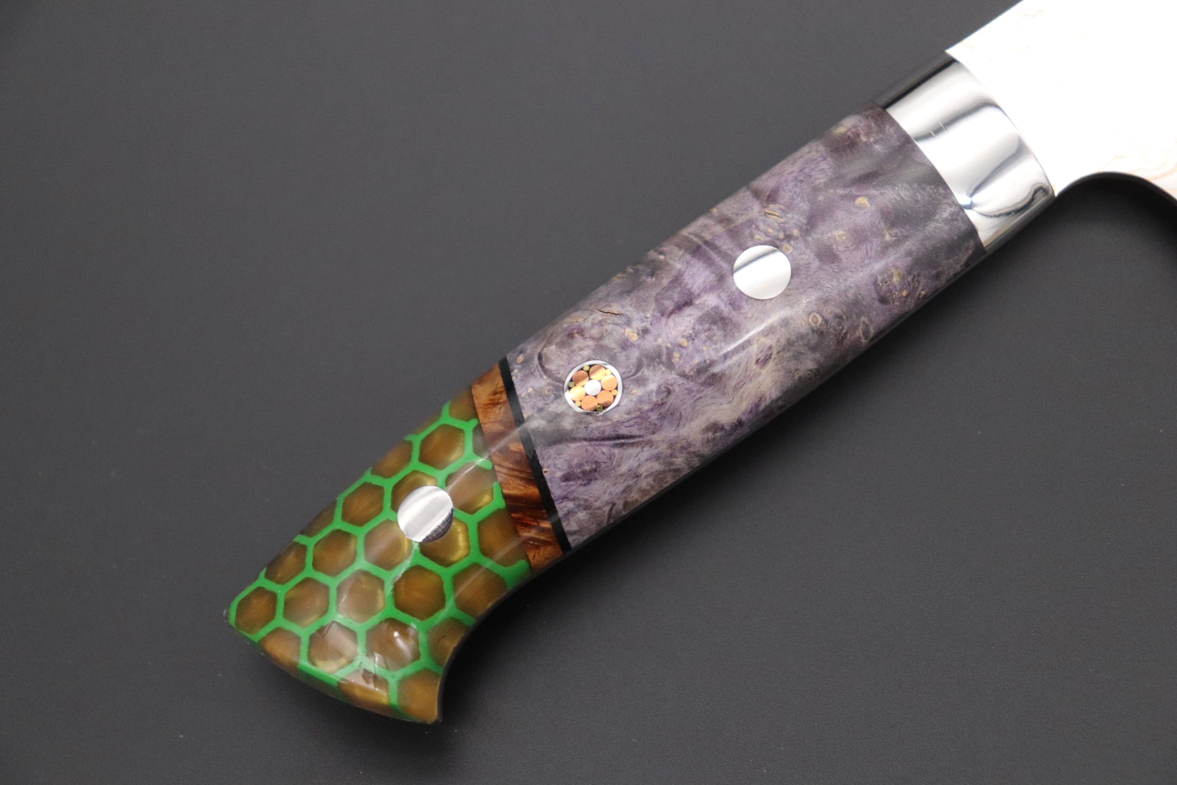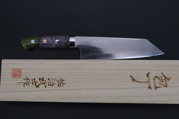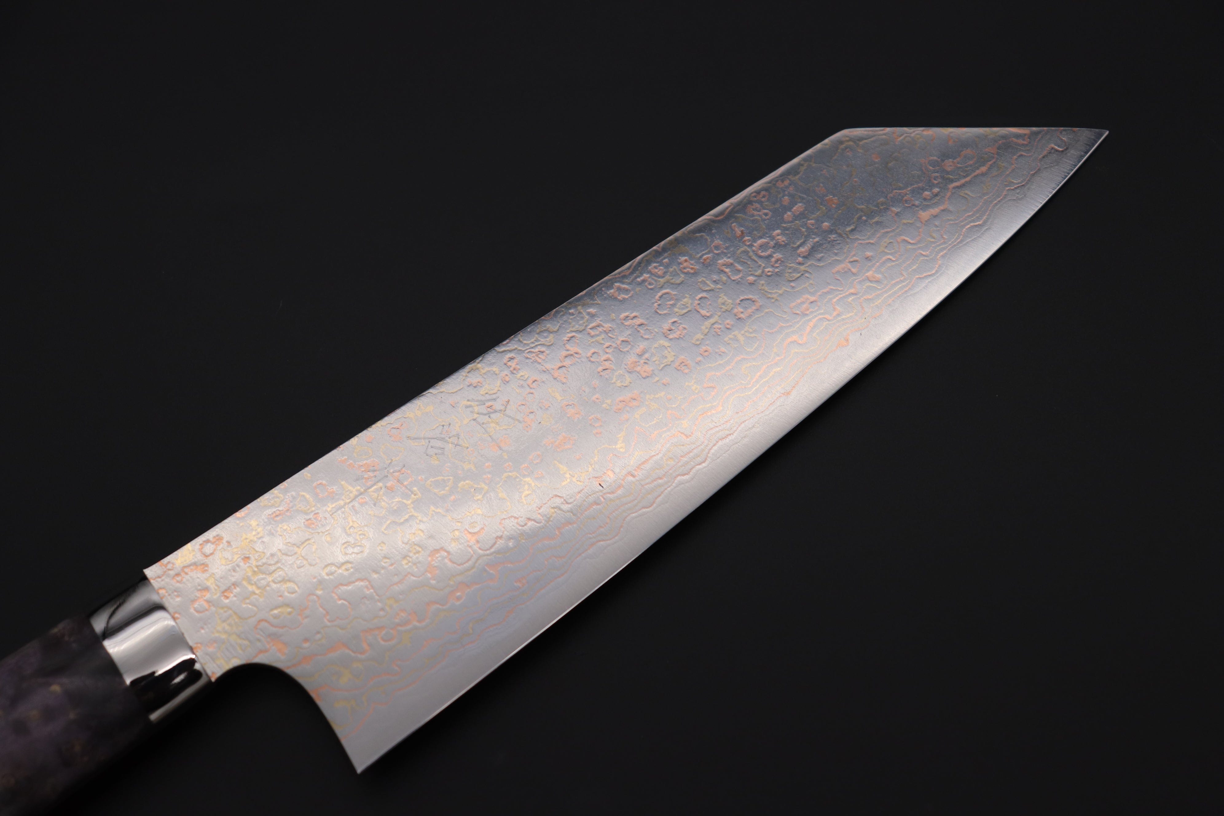 Master Saji has just completed a fresh new batch of traditional hammer forged custom kitchen knives that, once again, feature his unique multi-colored and beautiful polished Damascus. The blades have a core of VG-10W Cobalt-Tungsten Stainless steel (HR.c 61 to 62), which has been clad with multiple layers of rust-resistant stainless steel, brass and copper.