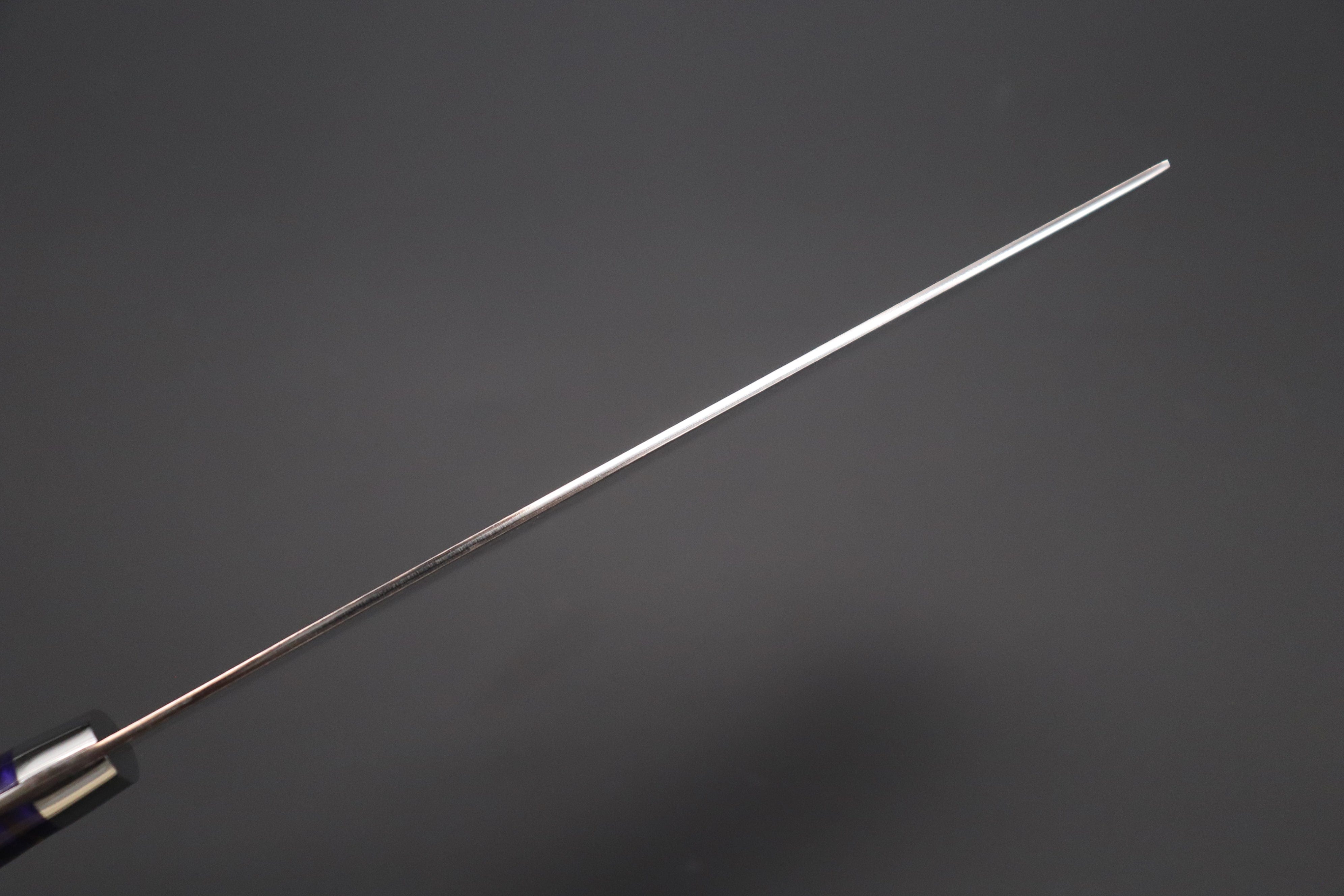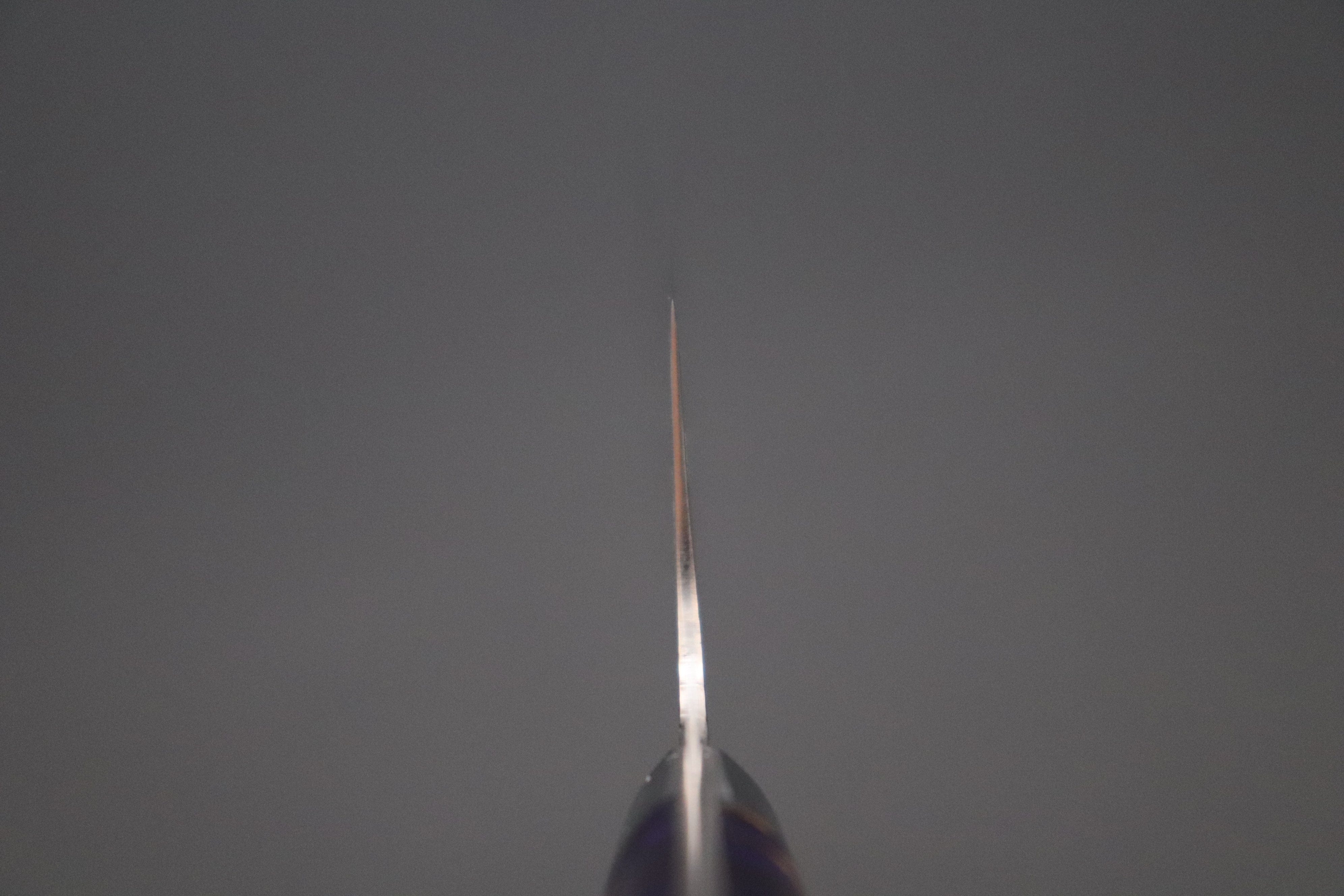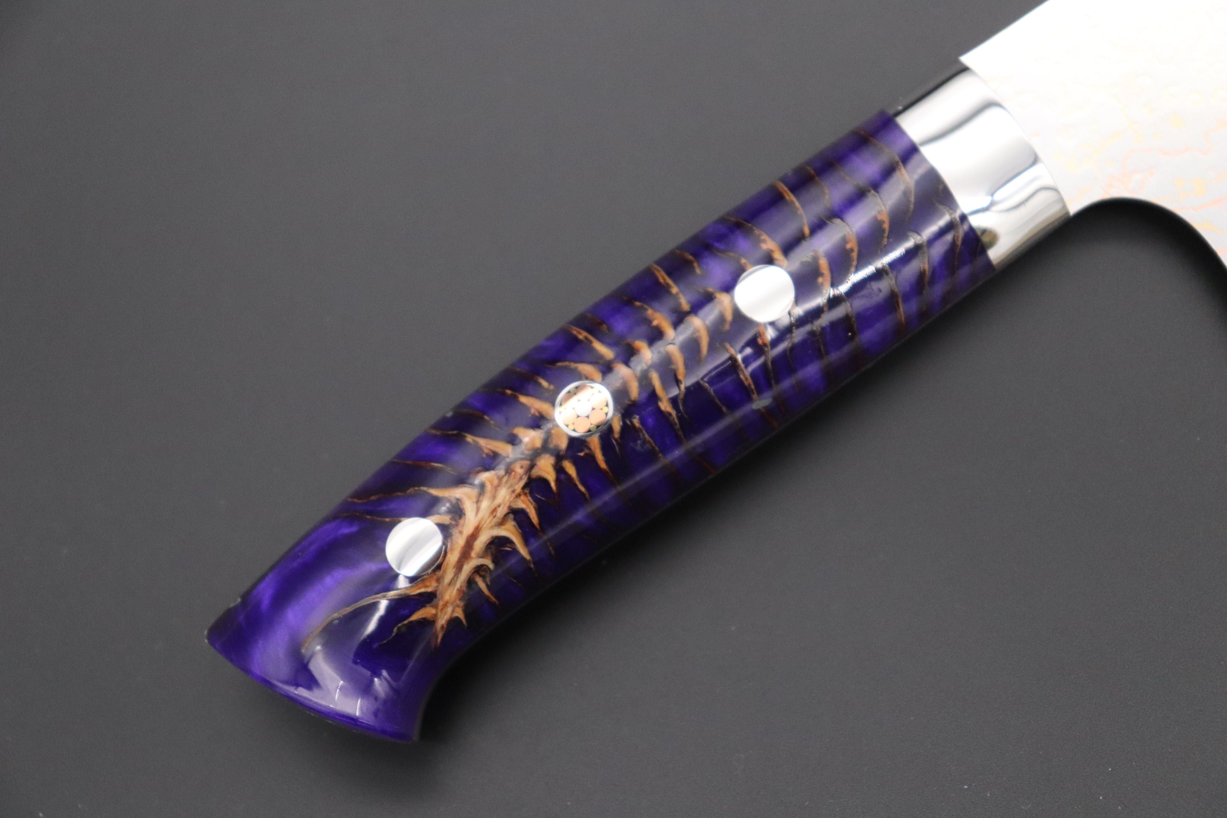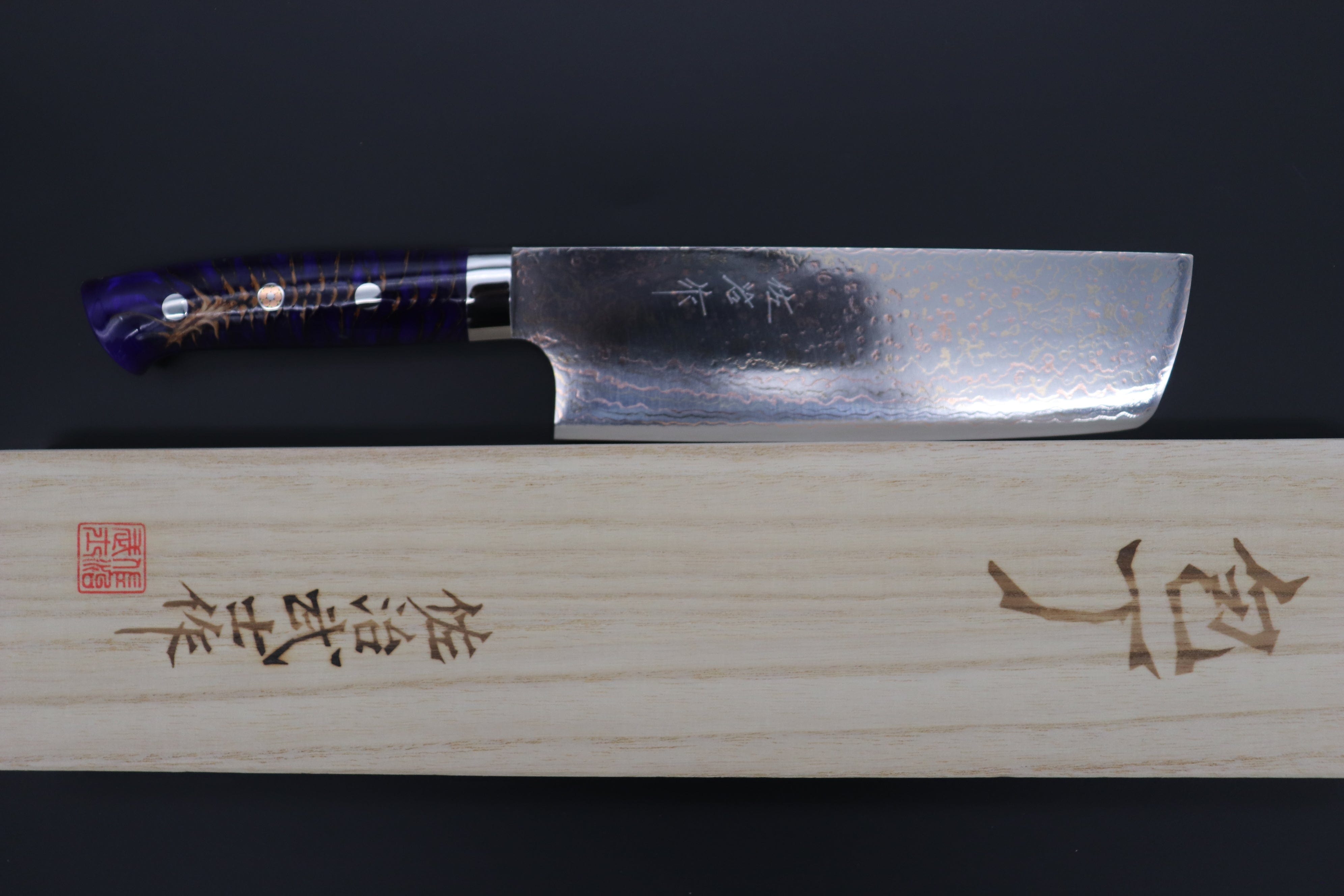 Master Saji has just completed a fresh new batch of traditional hammer forged custom kitchen knives that, once again, feature his unique multi-colored and beautiful polished Damascus. The blades have a core of VG-10W Cobalt-Tungsten Stainless steel (HR.c 61 to 62), which has been clad with multiple layers of rust-resistant stainless steel, brass and copper.