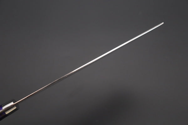 Takeshi Saji is a very well respected Master Smith, who specializes in making traditional hammer forged Japanese knives. We are often surprised by the variety of ideas he has and the very distinctive materials and rare steel that he uses for his custom knives.