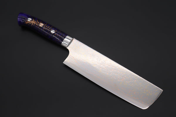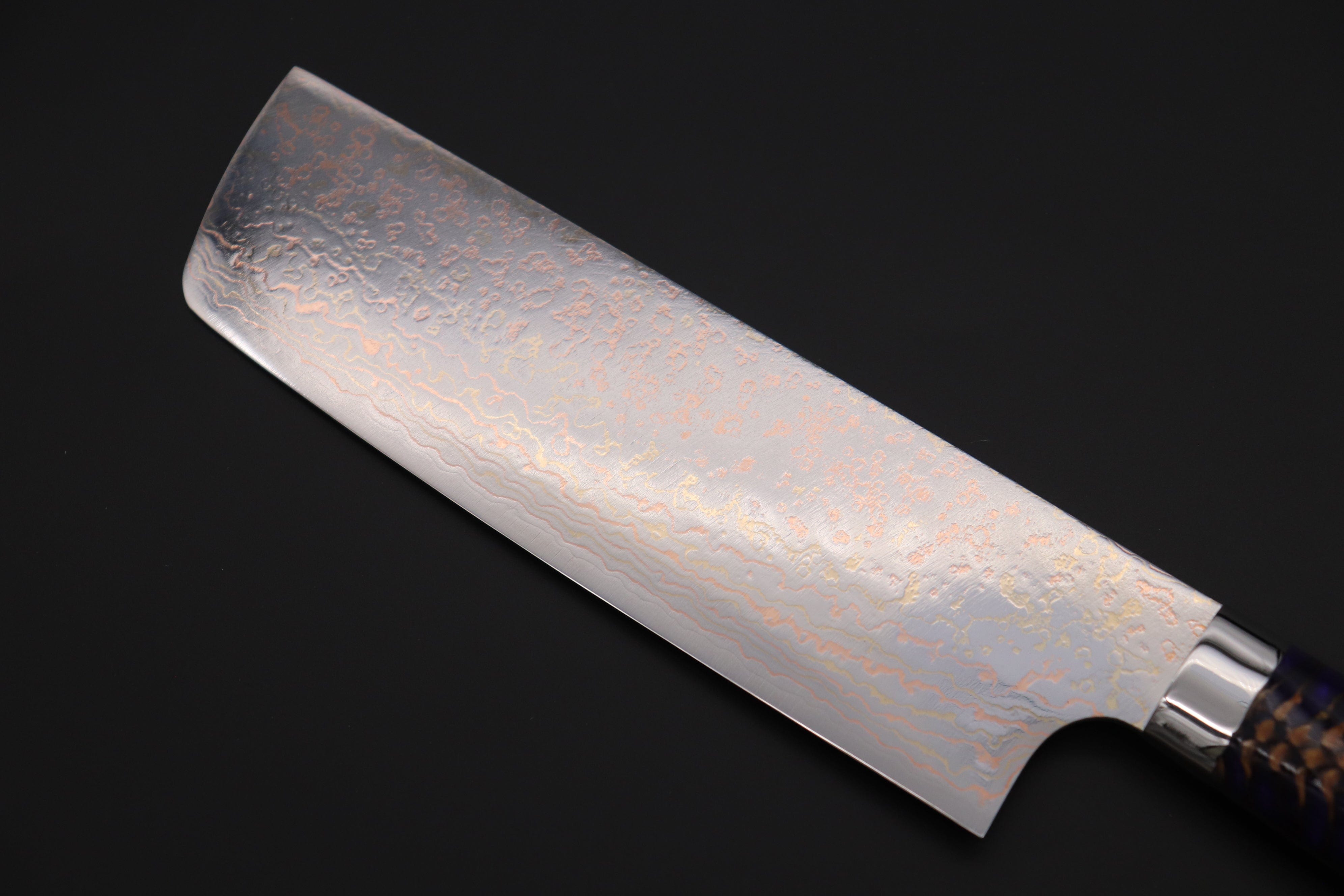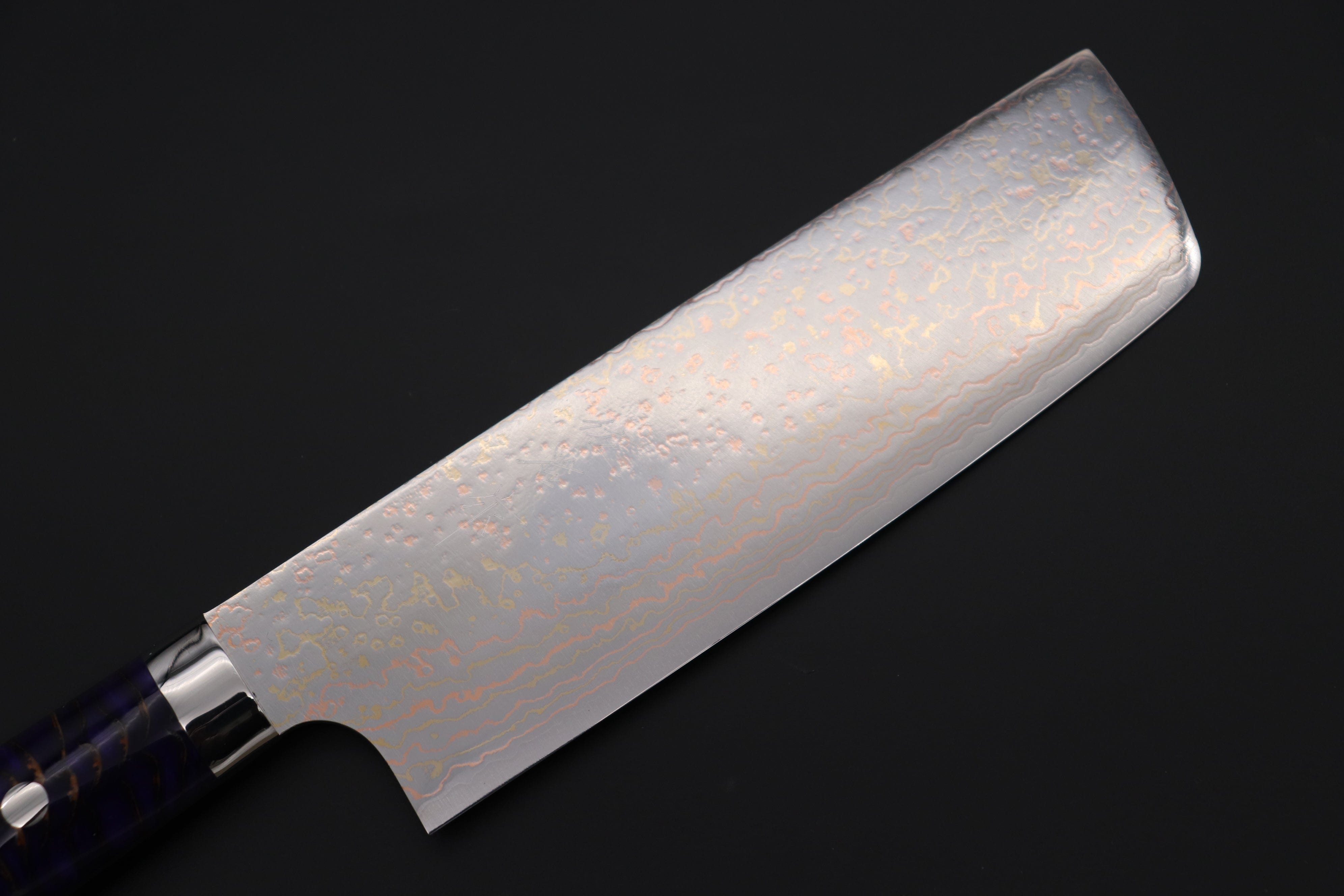 Knife Model: Takeshi Saji SUMMIT ― Limited Edition Custom Series SMT-991 VG-10W Multi-Colored Golden-Rainbow Damascus Nakiri 165mm