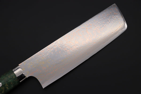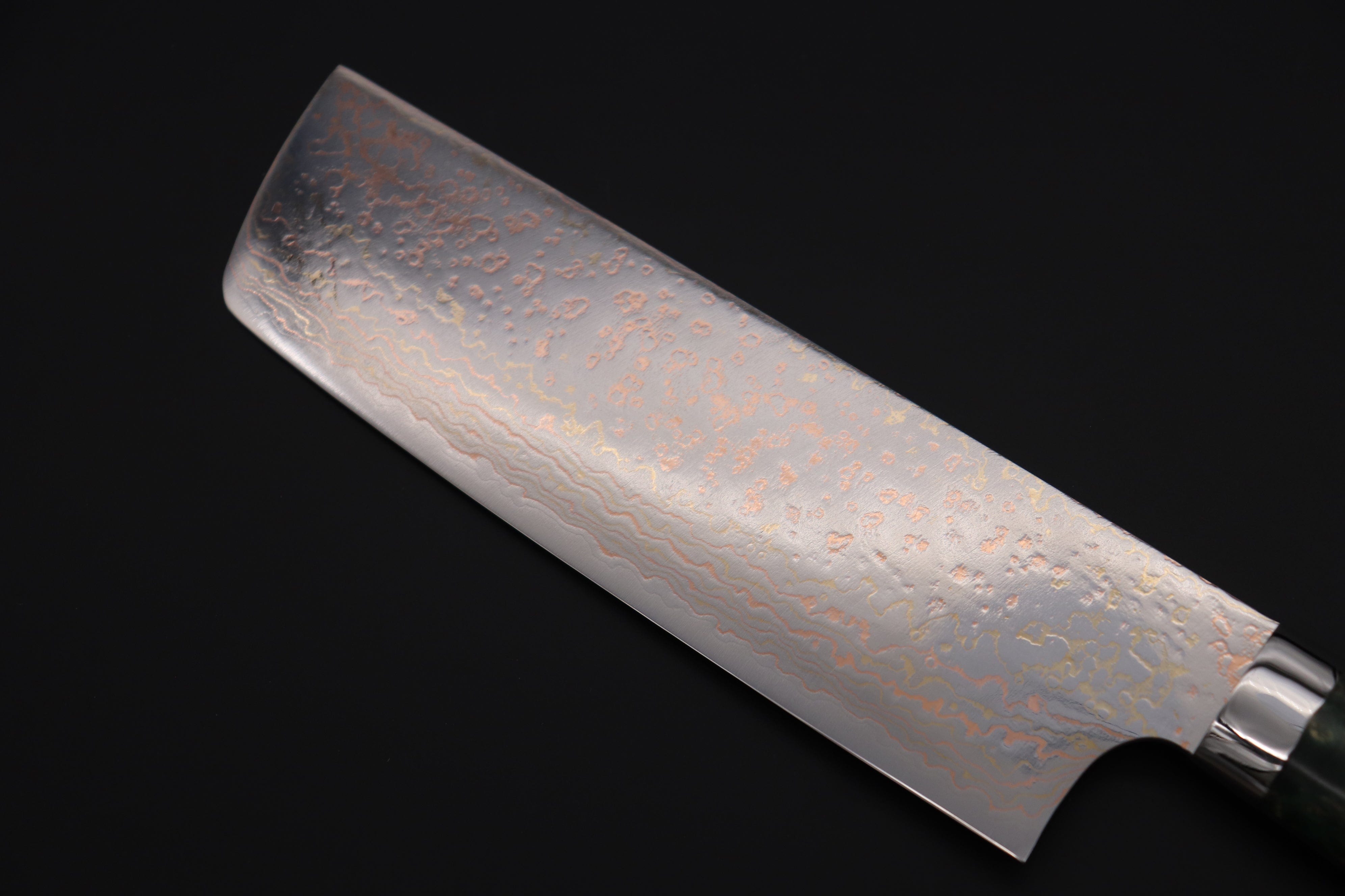 Knife Model: Takeshi Saji SUMMIT ― Limited Edition Custom Series SMT-993 VG-10W Multi-Colored Golden-Rainbow Damascus Nakiri 165mm