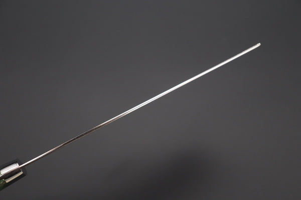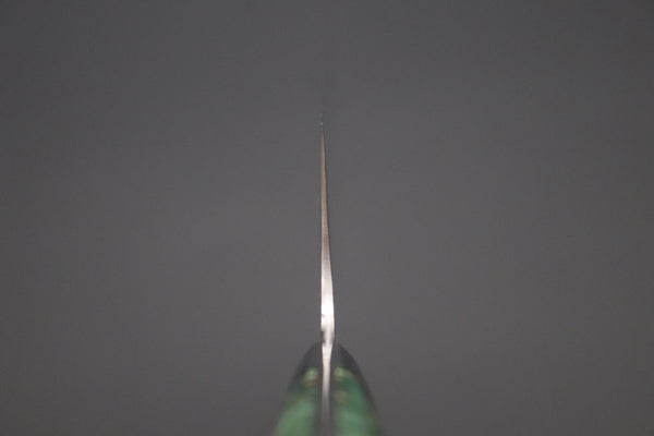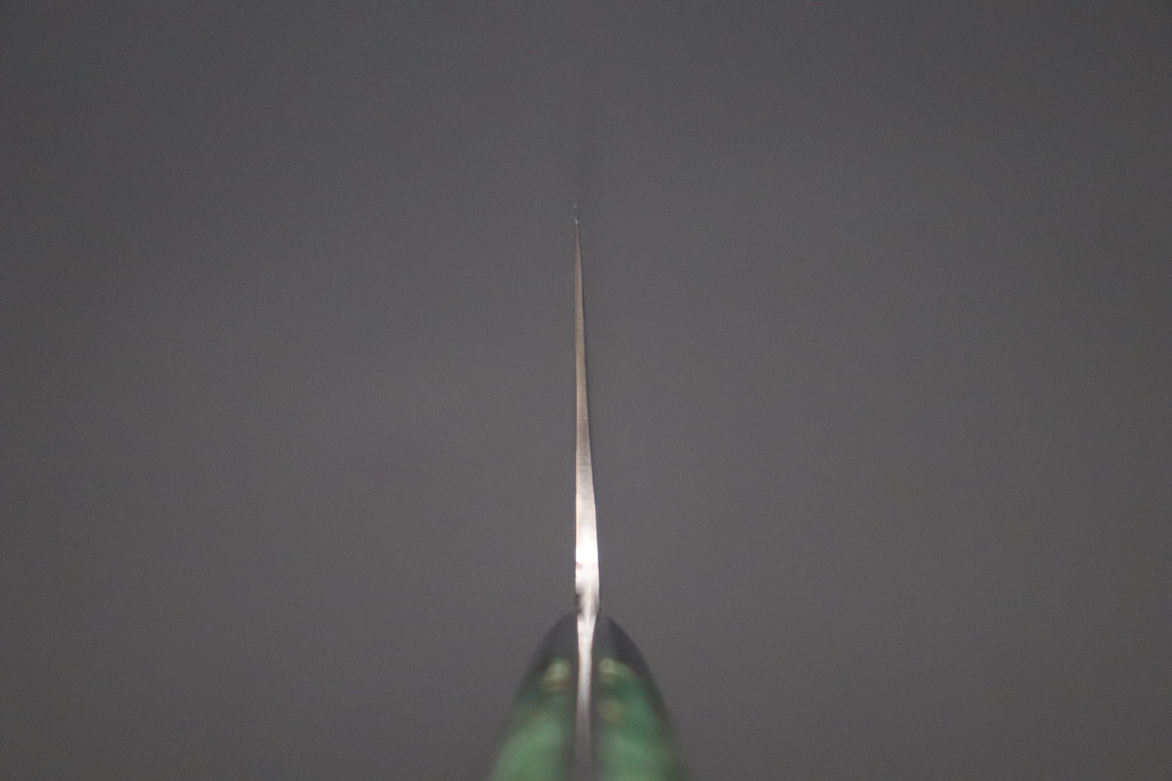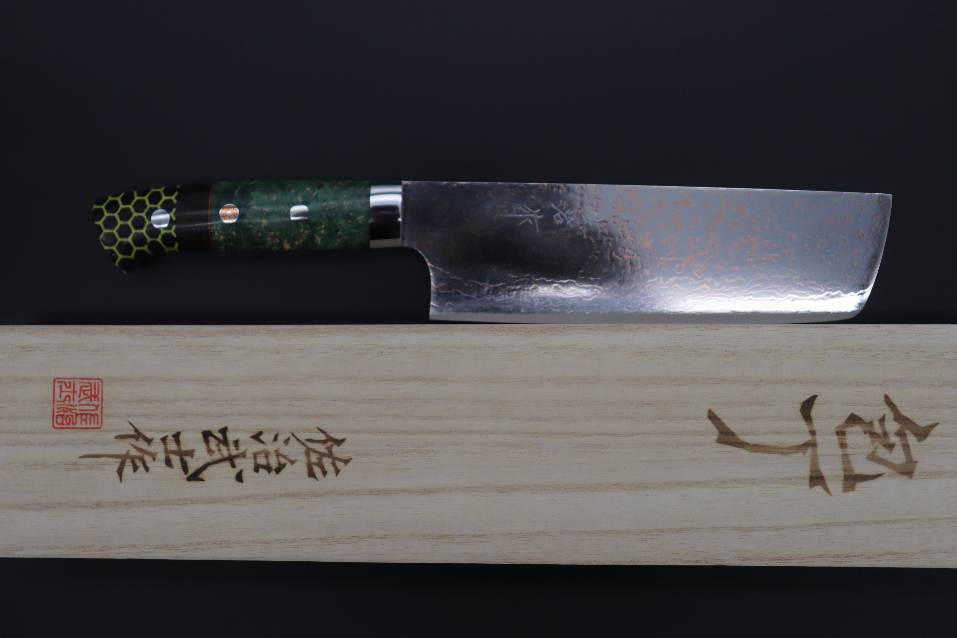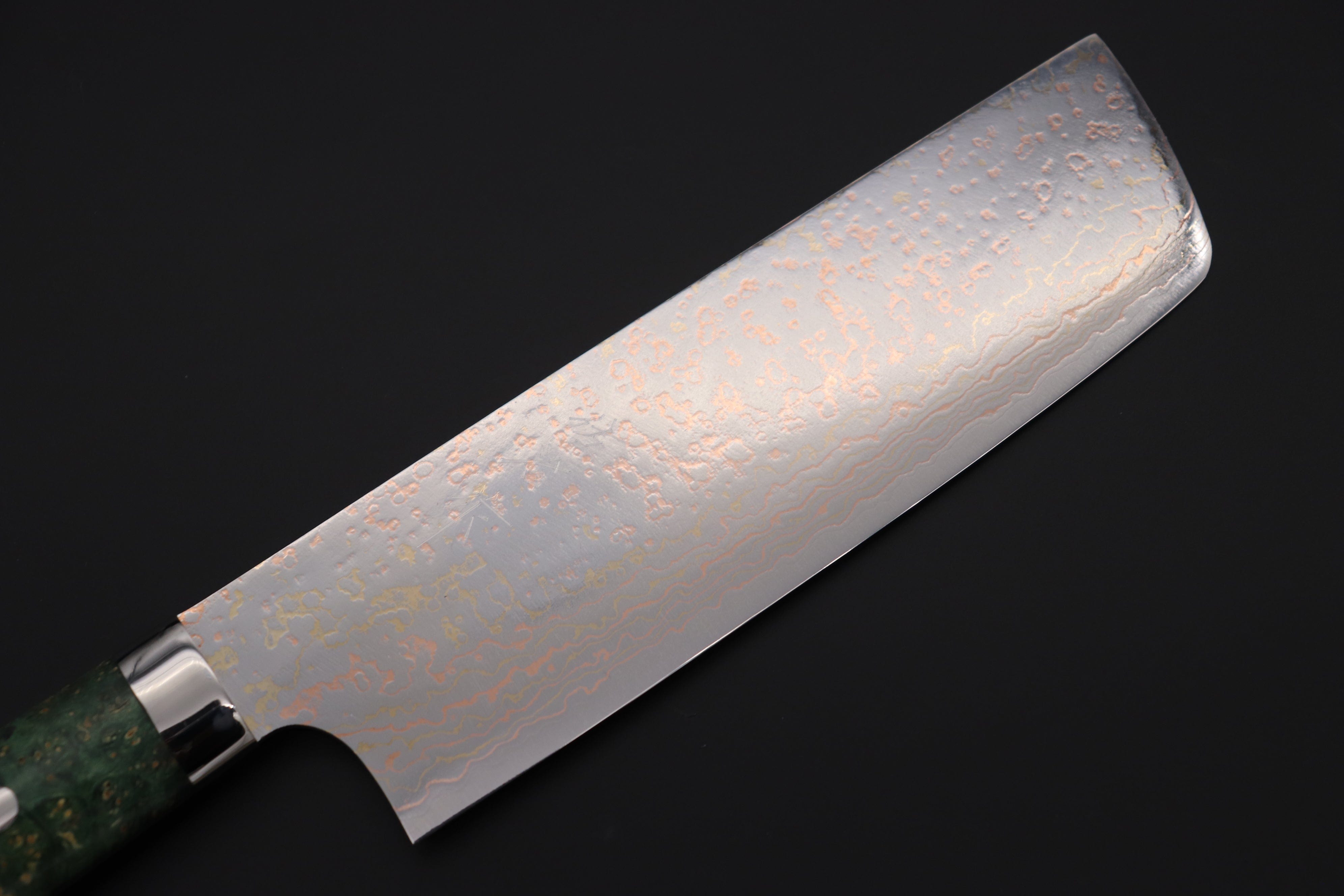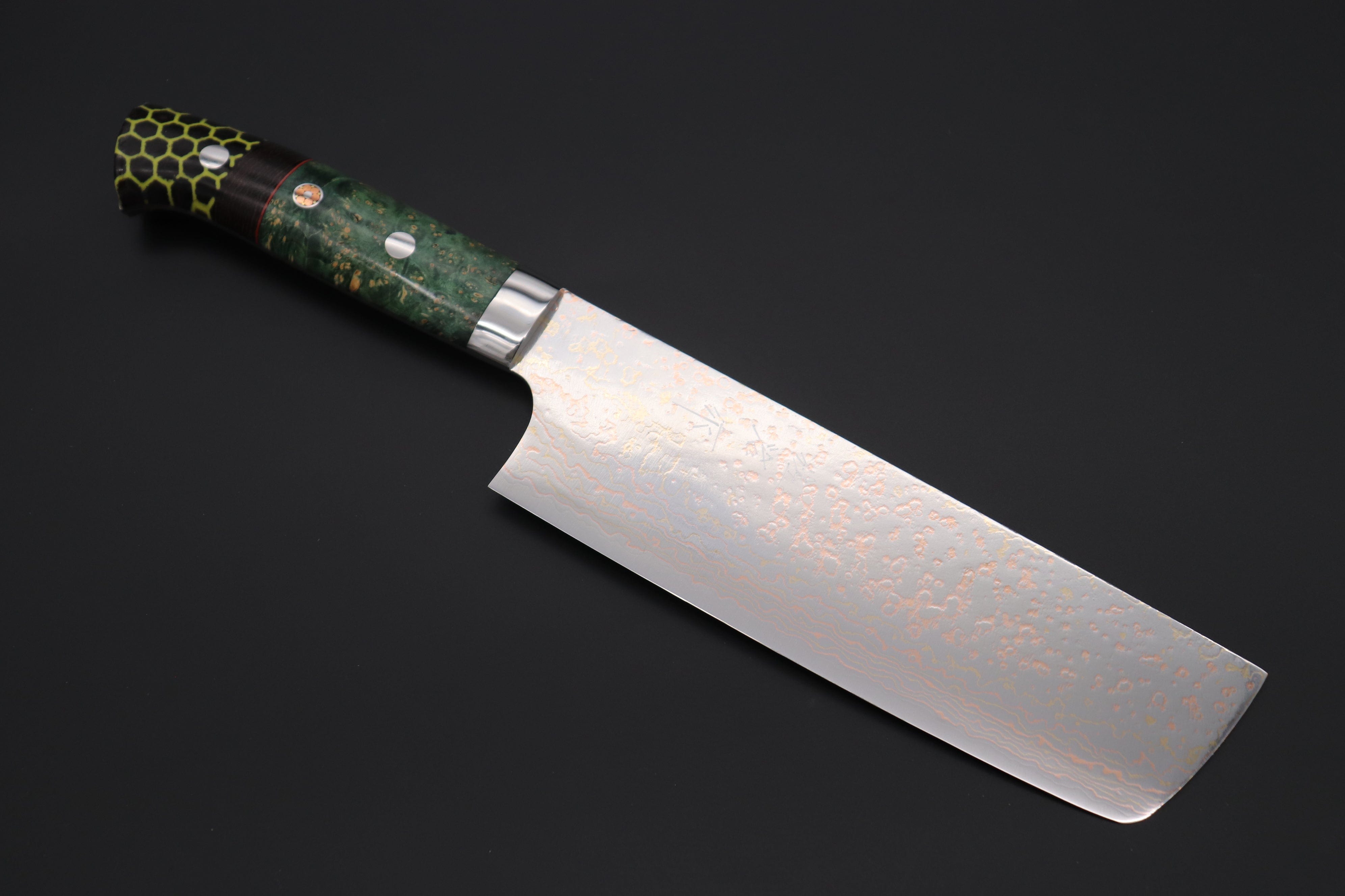 Master Saji has just completed a fresh new batch of traditional hammer forged custom kitchen knives that, once again, feature his unique multi-colored and beautiful polished Damascus. The blades have a core of VG-10W Cobalt-Tungsten Stainless steel (HR.c 61 to 62), which has been clad with multiple layers of rust-resistant stainless steel, brass and copper.