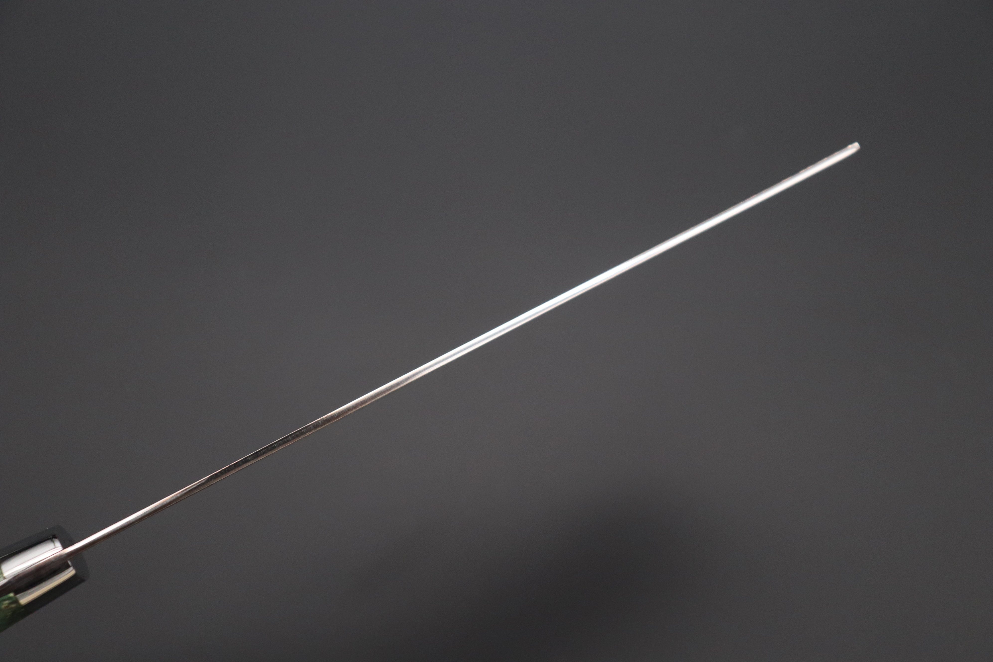 Takeshi Saji is a very well respected Master Smith, who specializes in making traditional hammer forged Japanese knives. We are often surprised by the variety of ideas he has and the very distinctive materials and rare steel that he uses for his custom knives.