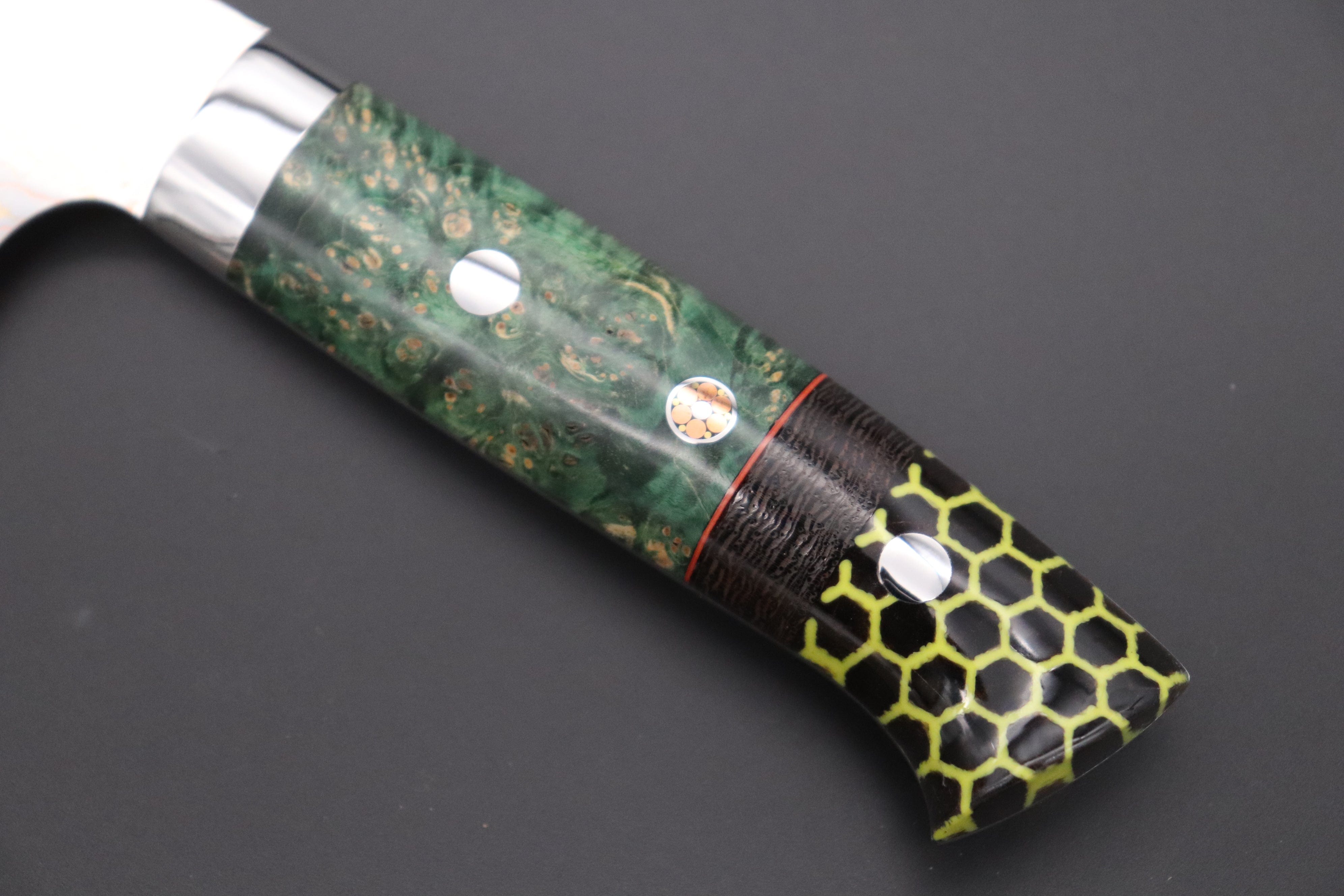 Handle Material: Green Color & Natural Wood Color & Lemon Yellow Color "Honey Comb Motif" Custom Combination Handle with Stainless Steel Bolster