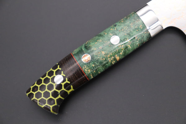 One day at the US Knife Show, we accidentally met with this Green Color & Natural Wood Color & Lemon Yellow Color "Honey Comb Motif" Custom Combination material. We promptly requested Master Saji to use this special wood for his very limited edition knife and now another masterpiece of Saji SUMMIT- Limited Edition Custom Series knife is available.