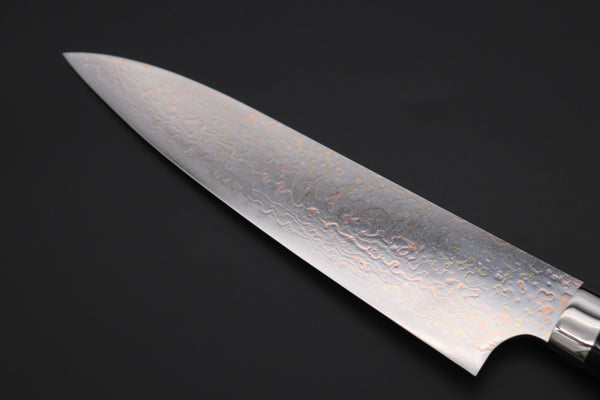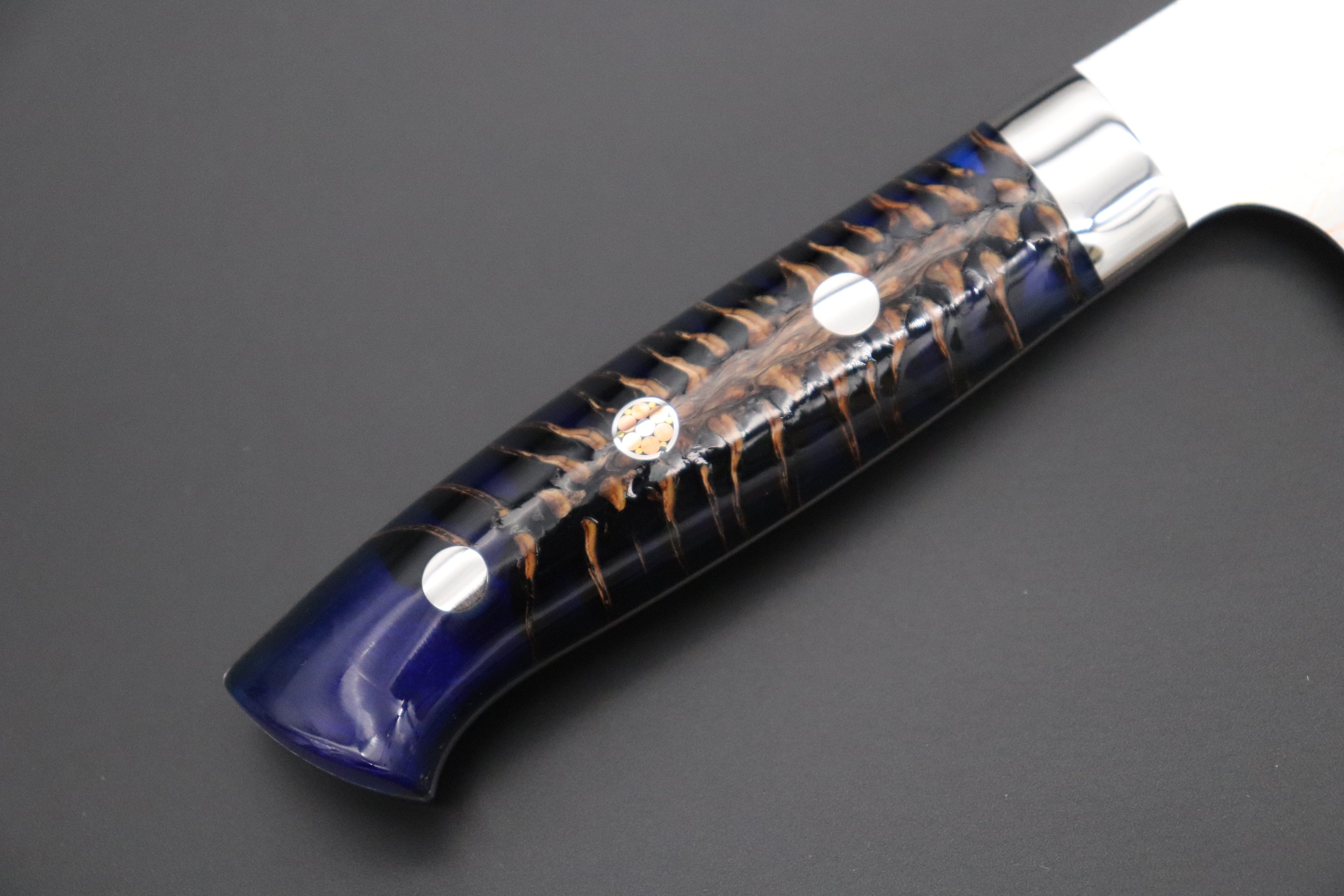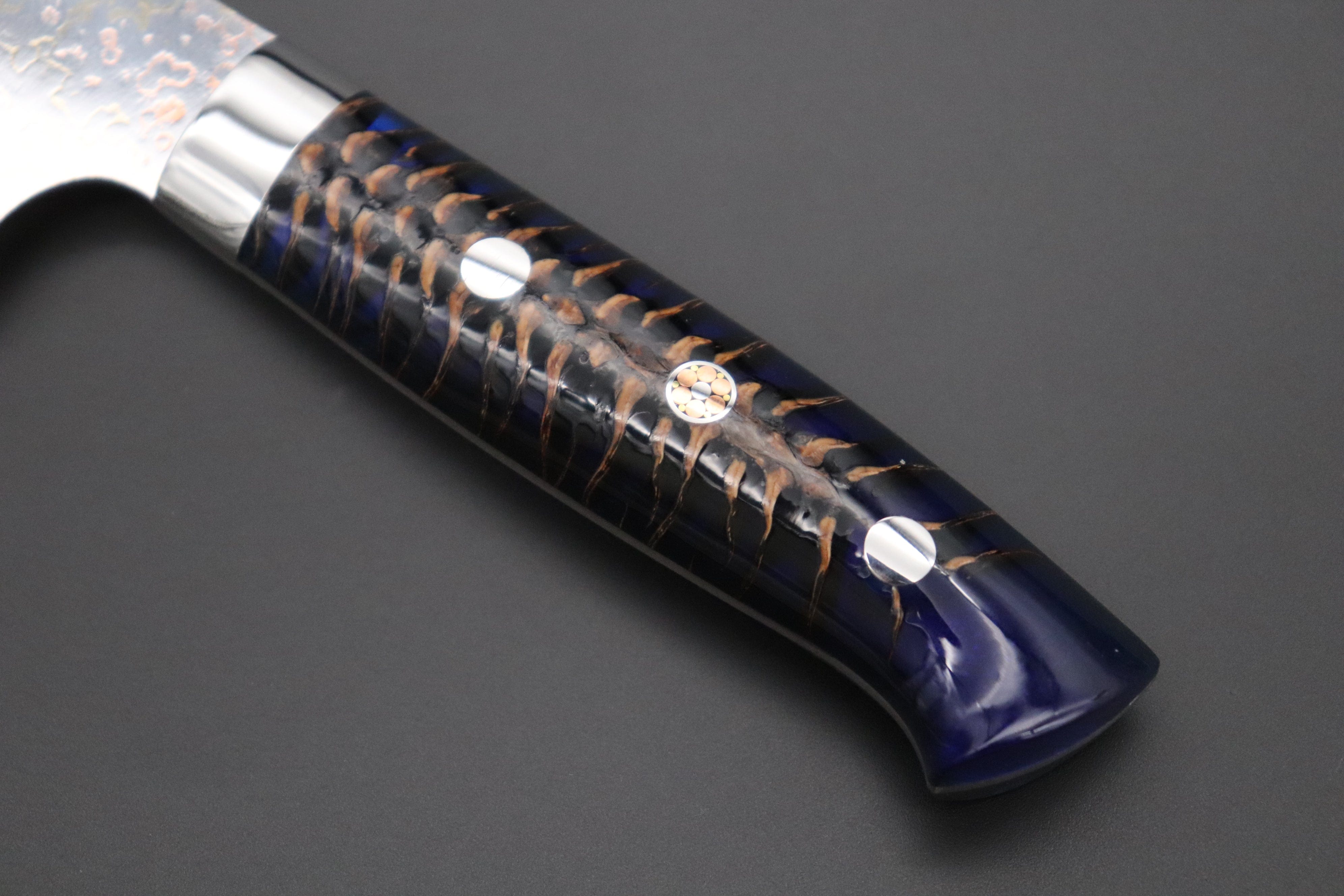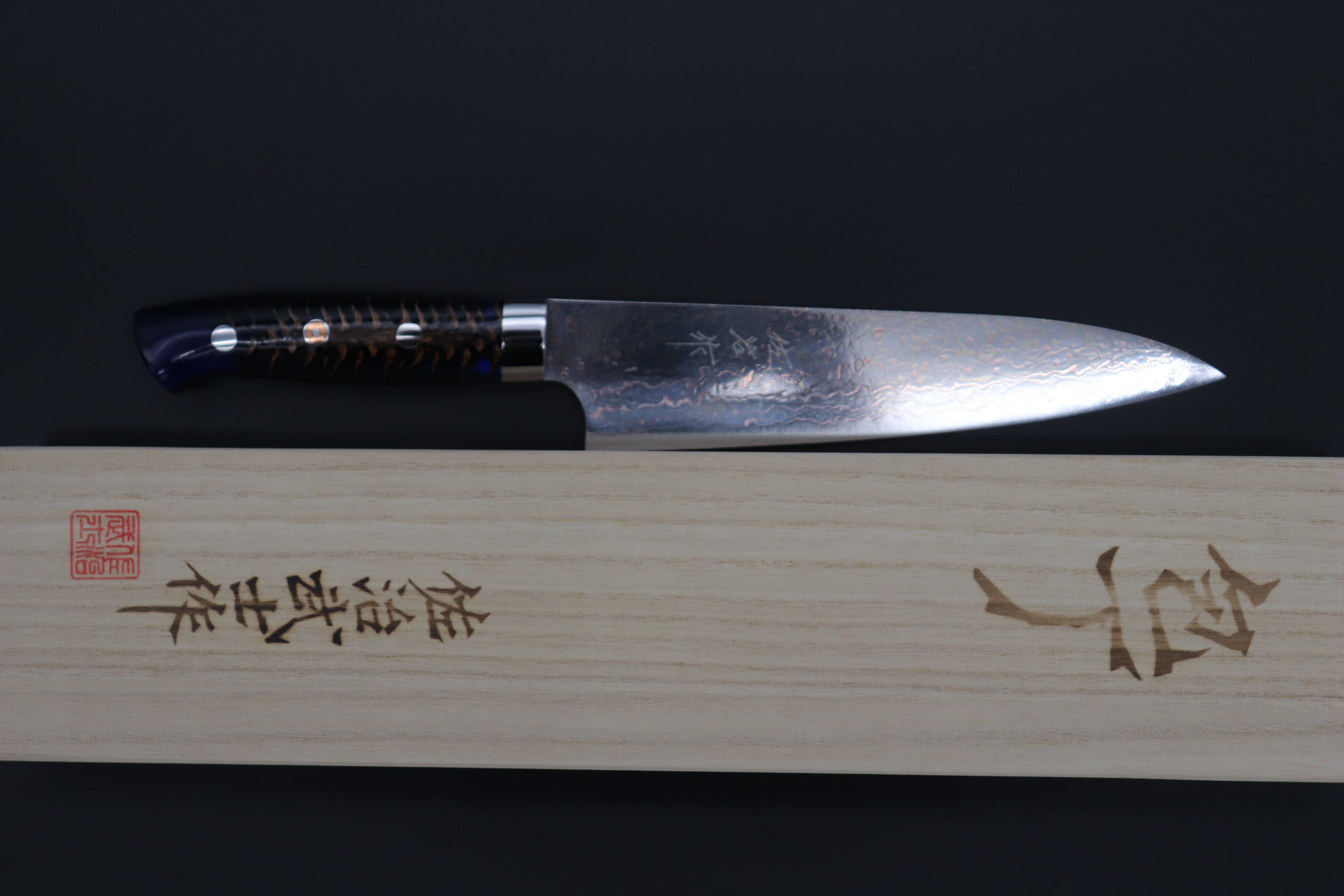 Master Saji has just completed a fresh new batch of traditional hammer forged custom kitchen knives that, once again, feature his unique multi-colored and beautiful polished Damascus. The blades have a core of VG-10W Cobalt-Tungsten Stainless steel (HR.c 61 to 62), which has been clad with multiple layers of rust-resistant stainless steel, brass and copper.