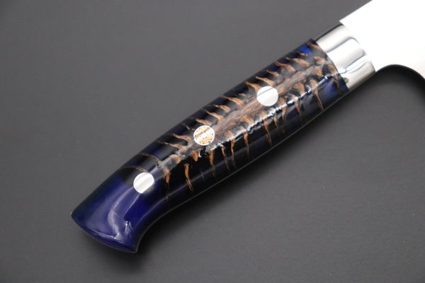 Takeshi Saji is a very well respected Master Smith, who specializes in making traditional hammer forged Japanese knives. We are often surprised by the variety of ideas he has and the very distinctive materials and rare steel that he uses for his custom knives.
