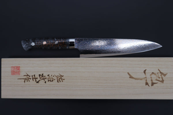 Takeshi Saji is a very well respected Master Smith, who specializes in making traditional hammer forged Japanese knives. We are often surprised by the variety of ideas he has and the very distinctive materials and rare steel that he uses for his custom knives.