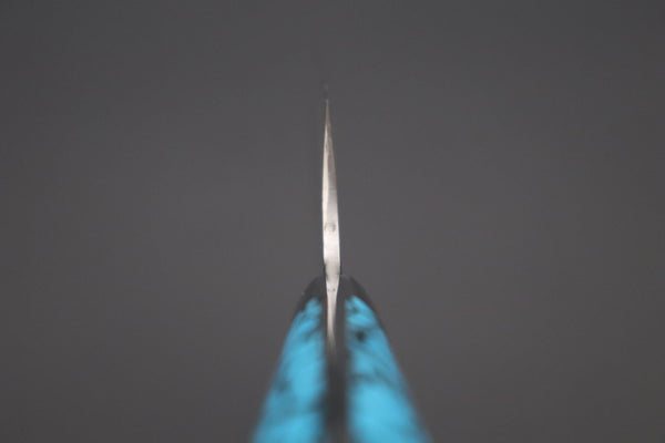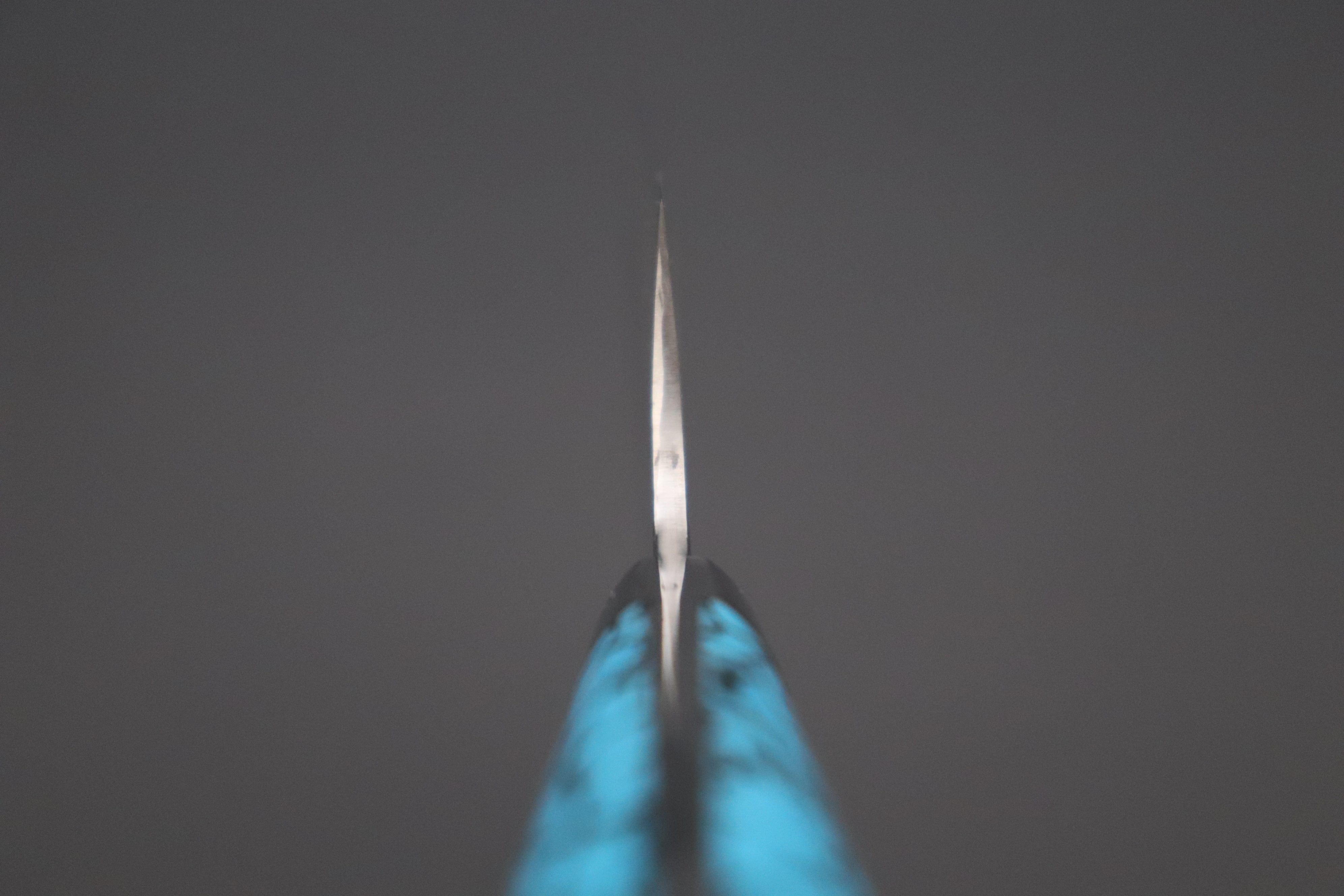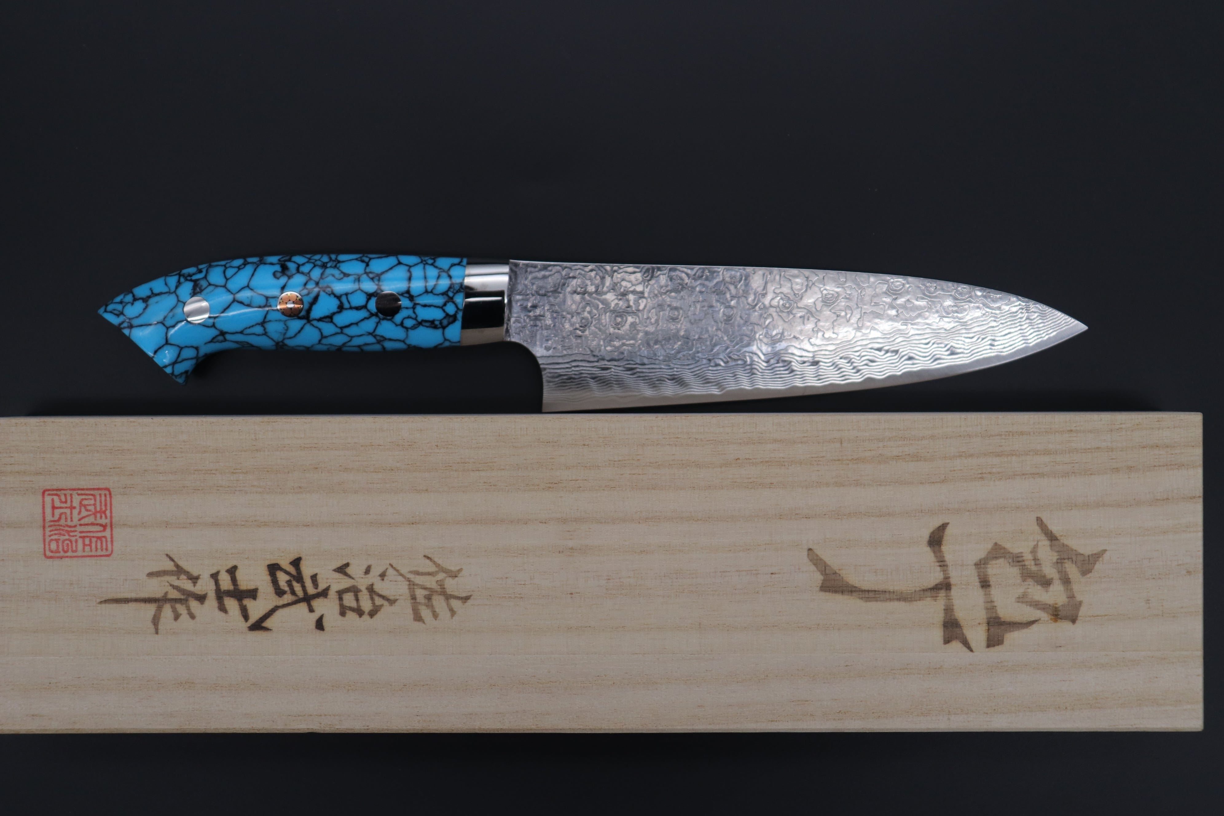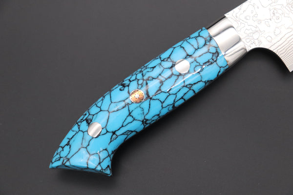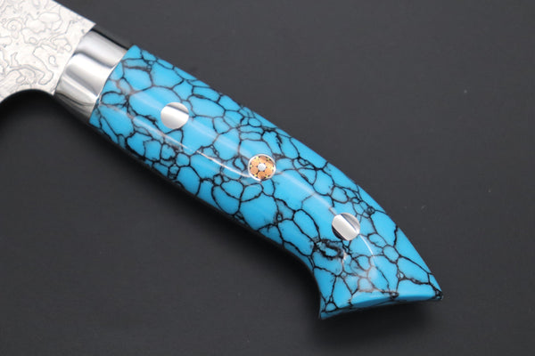 One day at the US Knife Show, we accidentaly met with this stylish and practical material, "Ocean Blue Color Turquoise Gem-Composite Stone". Turquoise Gem-Composite Stone is a unique, high-quality material made from a blend of natural stone powders and resin. This composite stone retains the vibrant color and distinctive patterns of turquoise while offering enhanced durability and strength. We promptly requested Master Saji to use this special material for his very limited edition knife and now another masterpiece of Saji SUMMIT- Limited Edition Custom Series knife is available.