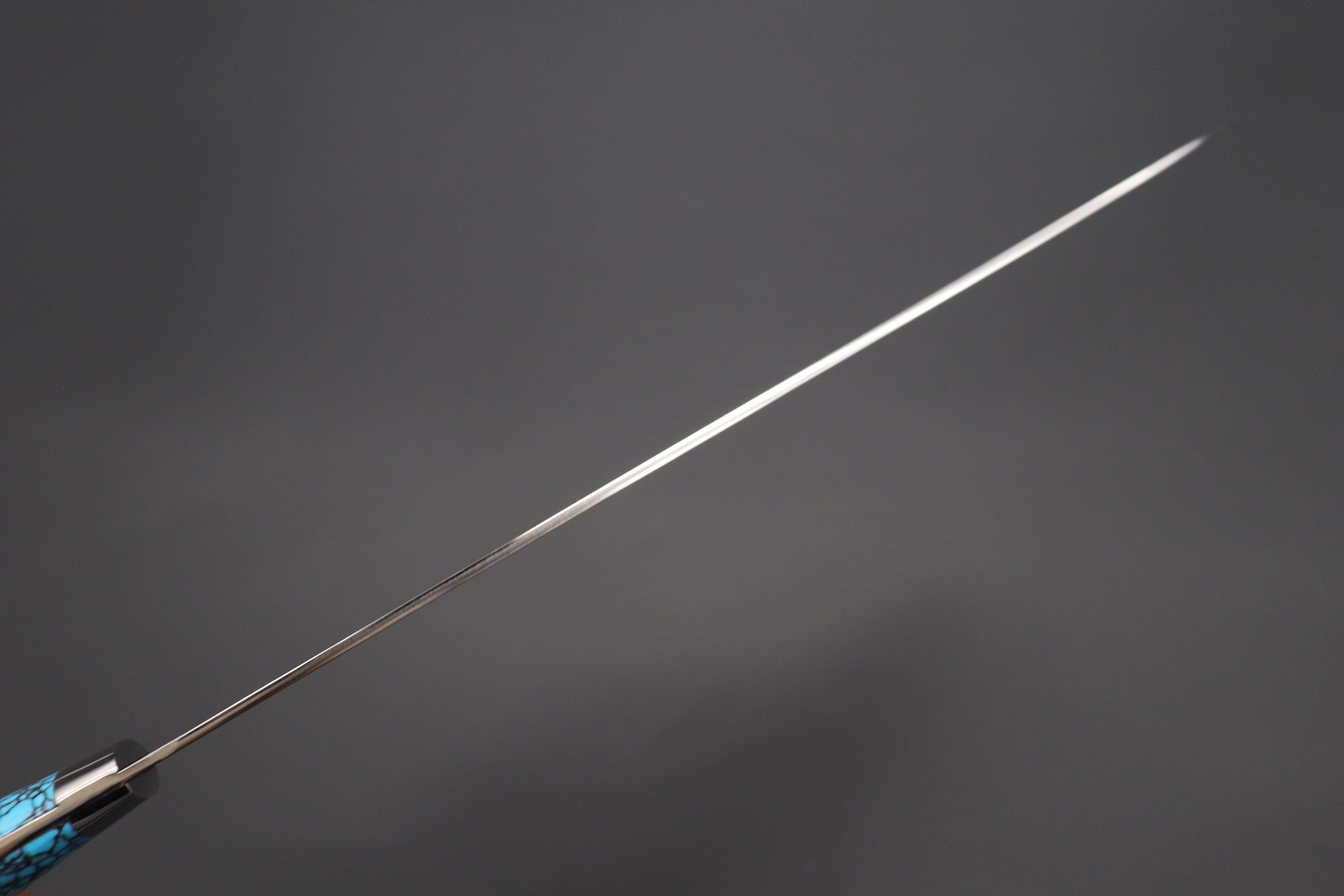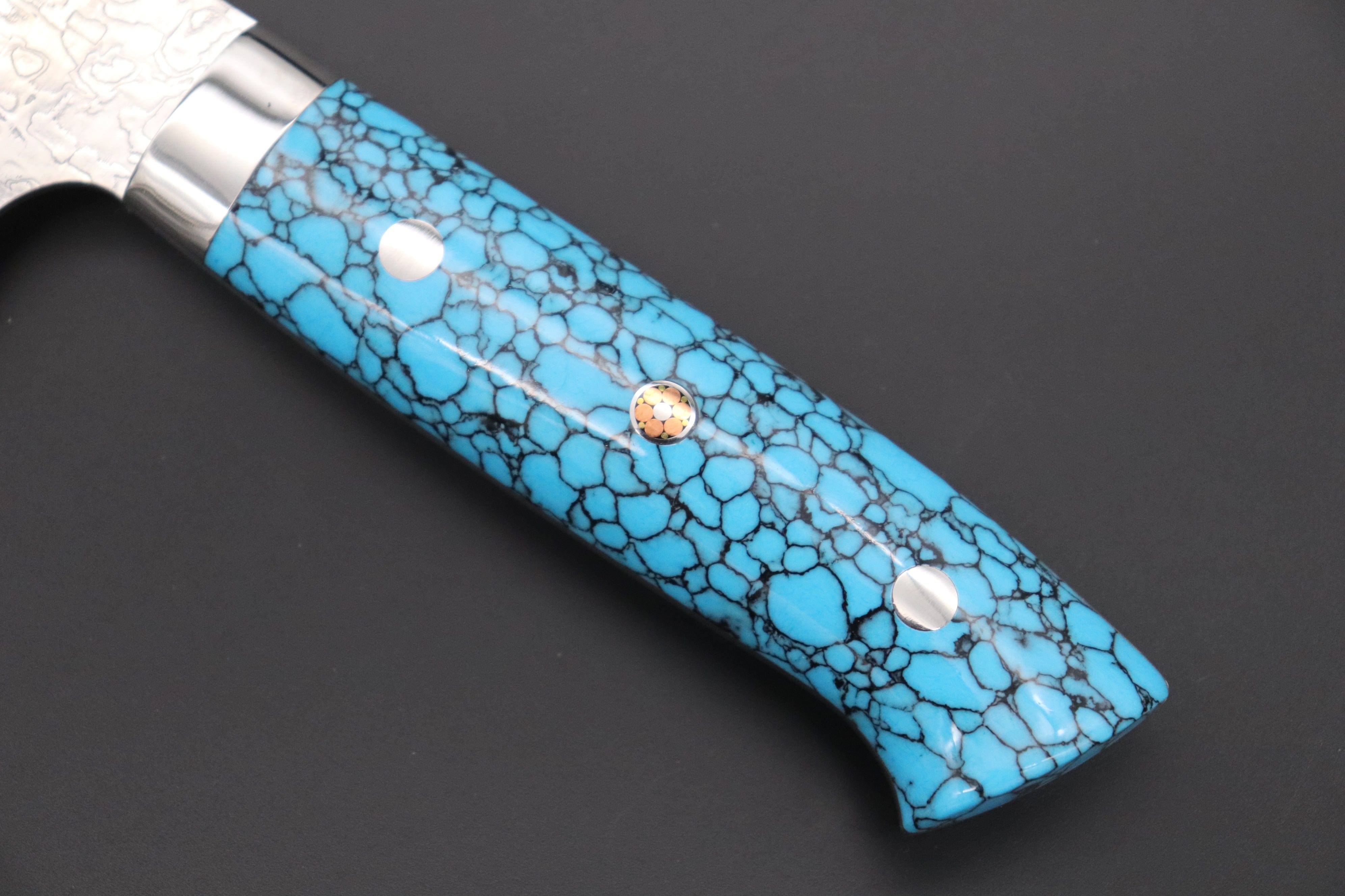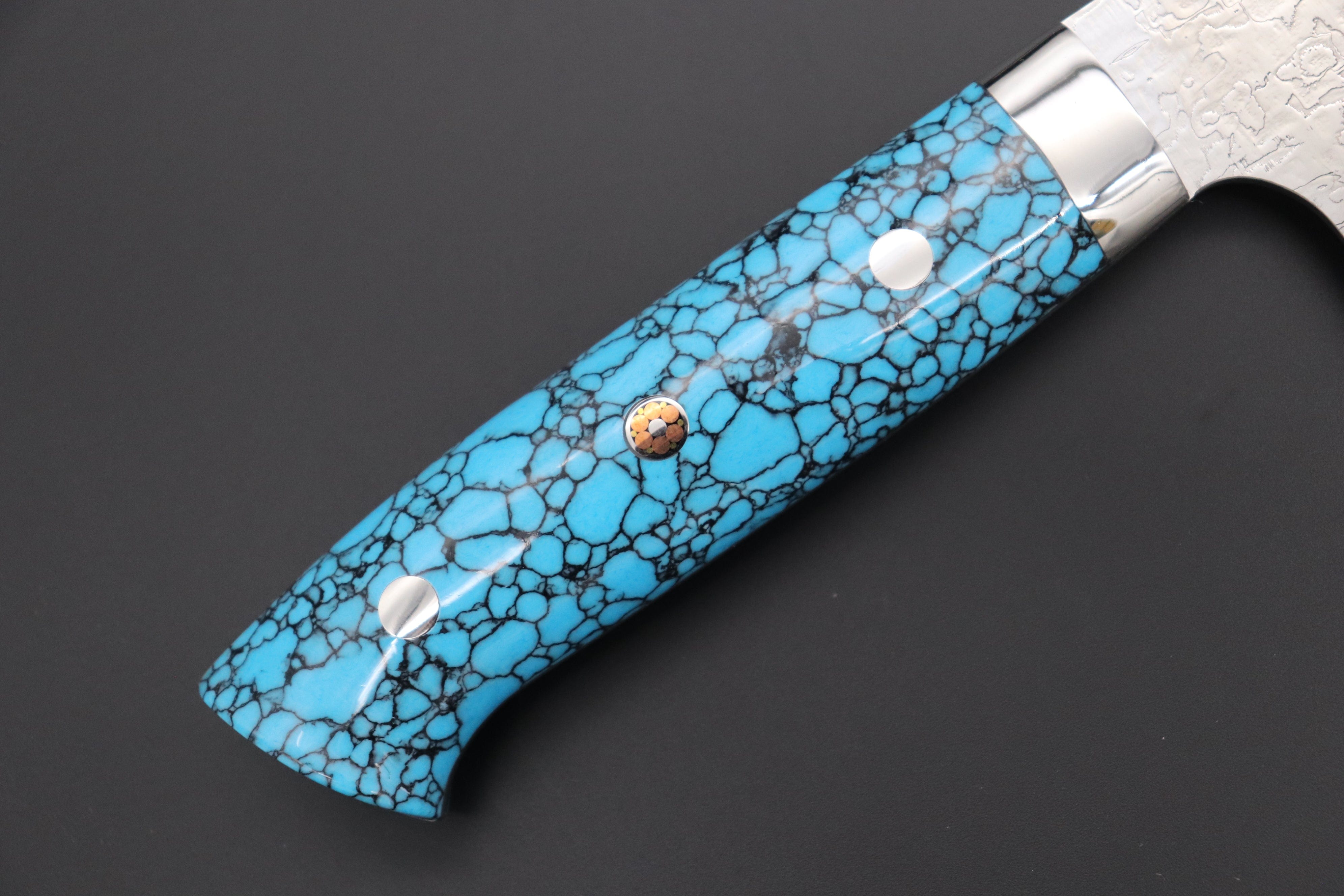One day at the US Knife Show, we accidentaly met with this stylish and practical material, "Ocean Blue Color Turquoise Gem-Composite Stone". Turquoise Gem-Composite Stone is a unique, high-quality material made from a blend of natural stone powders and resin. This composite stone retains the vibrant color and distinctive patterns of turquoise while offering enhanced durability and strength. We promptly requested Master Saji to use this special material for his very limited edition knife and now another masterpiece of Saji SUMMIT- Limited Edition Custom Series knife is available.