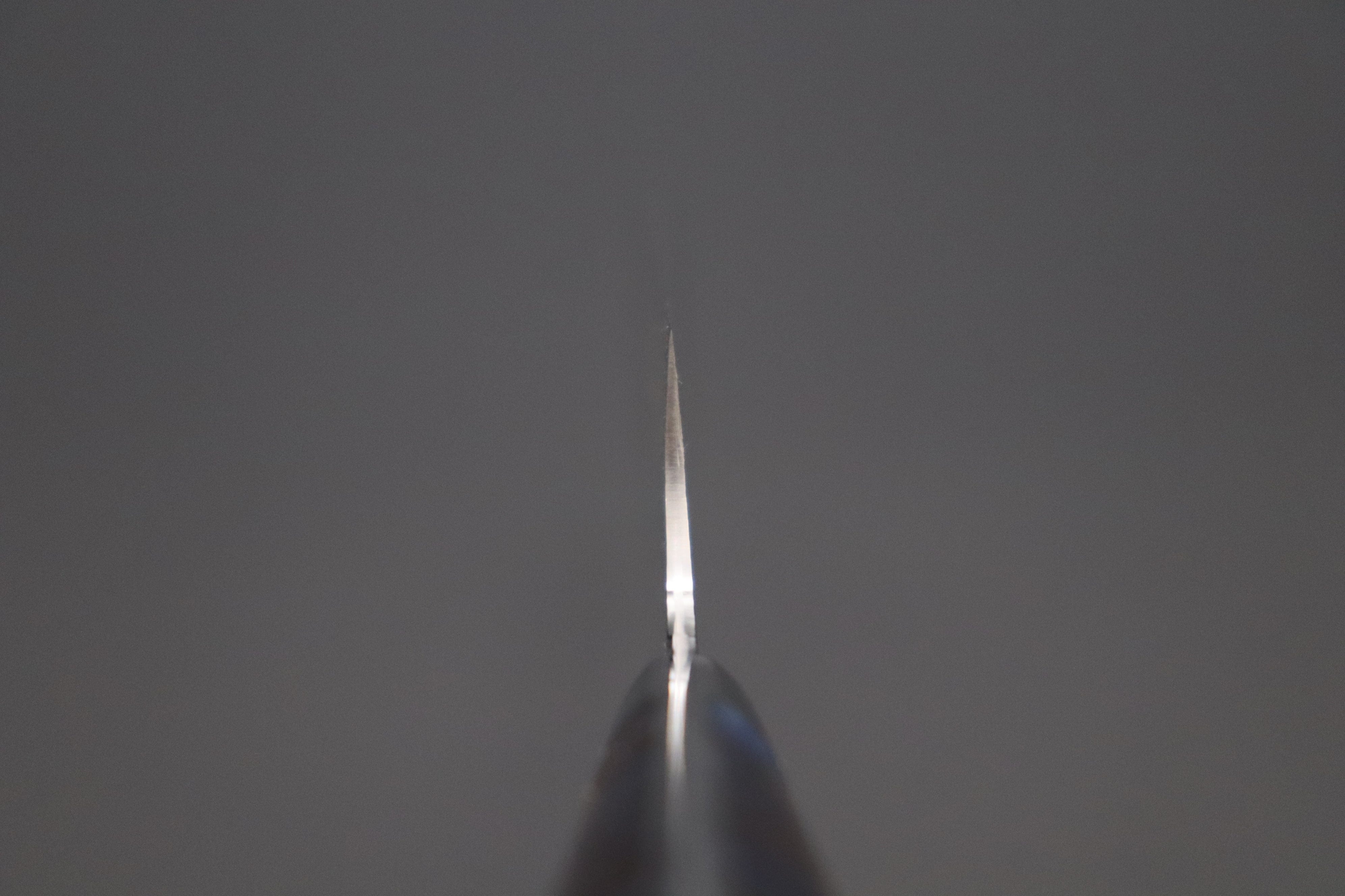 Katana Slicer is easily identifiable by their blade tips, which look similar to that of a Katana. The long, narrow blade of Katana slicer is particularly useful for slicing meat, boneless fish, roast beef and ham. The long blade allows the meat or fish to be cut in one single drawing motion, from heel to tip.