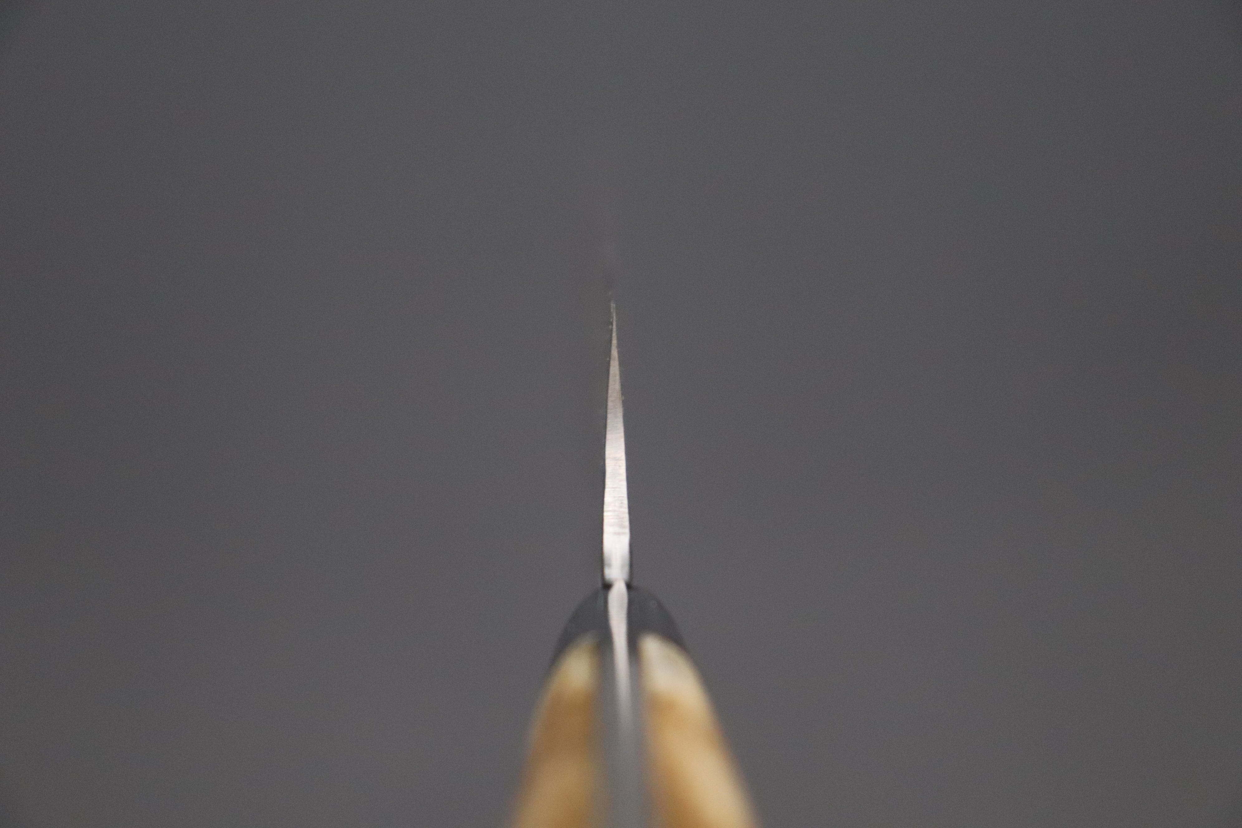 Katana Slicer is easily identifiable by their blade tips, which look similar to that of a Katana. The long, narrow blade of Katana slicer is particularly useful for slicing meat, boneless fish, roast beef and ham. The long blade allows the meat or fish to be cut in one single drawing motion, from heel to tip.