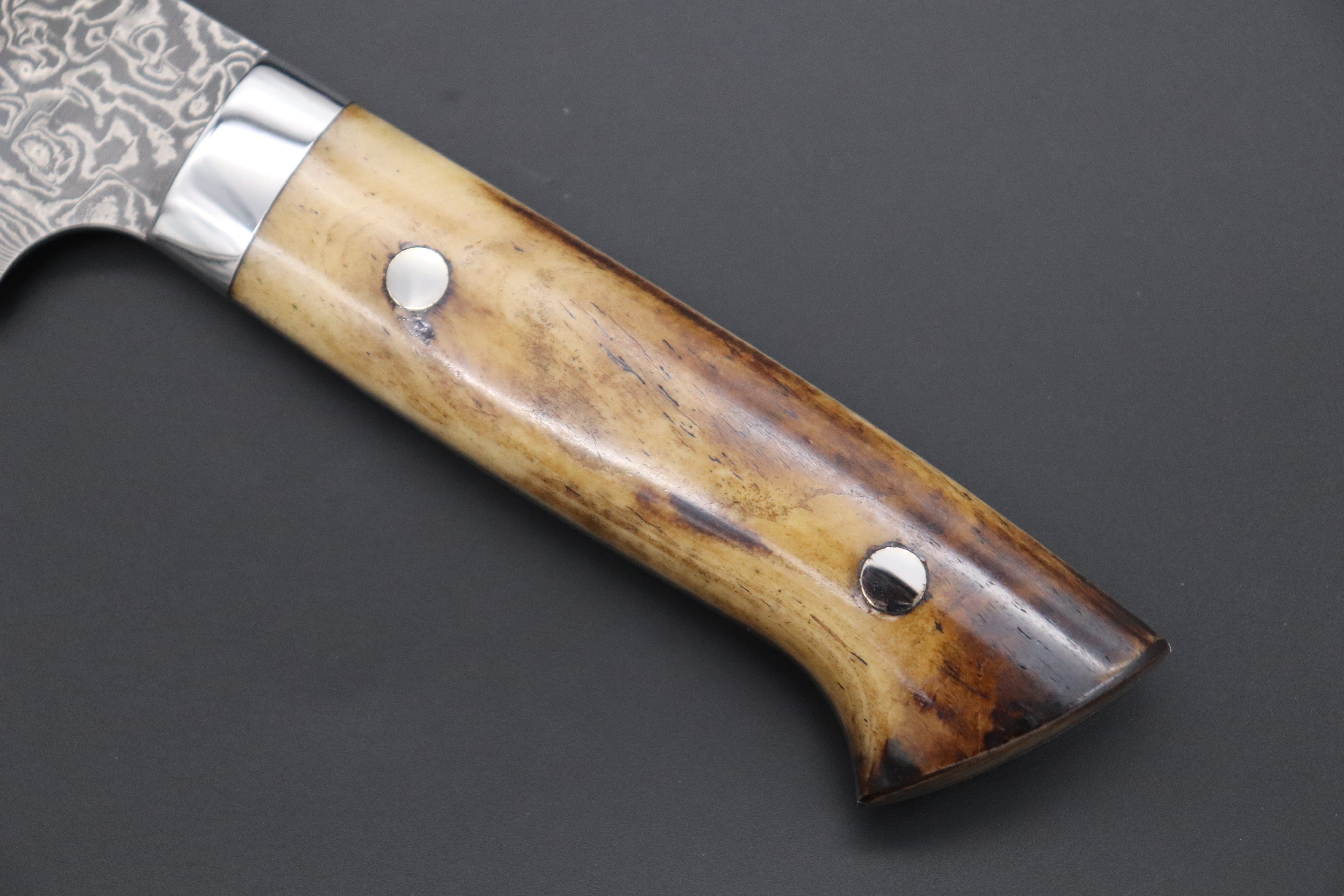 A dark R-2 Damascus blade, which features a crisp and vigorous Damascus pattern. This knife fitted with Stag Bone handle scales and polished stainless steel bolster and rivets, which match the energetic style of the Damascus blade.