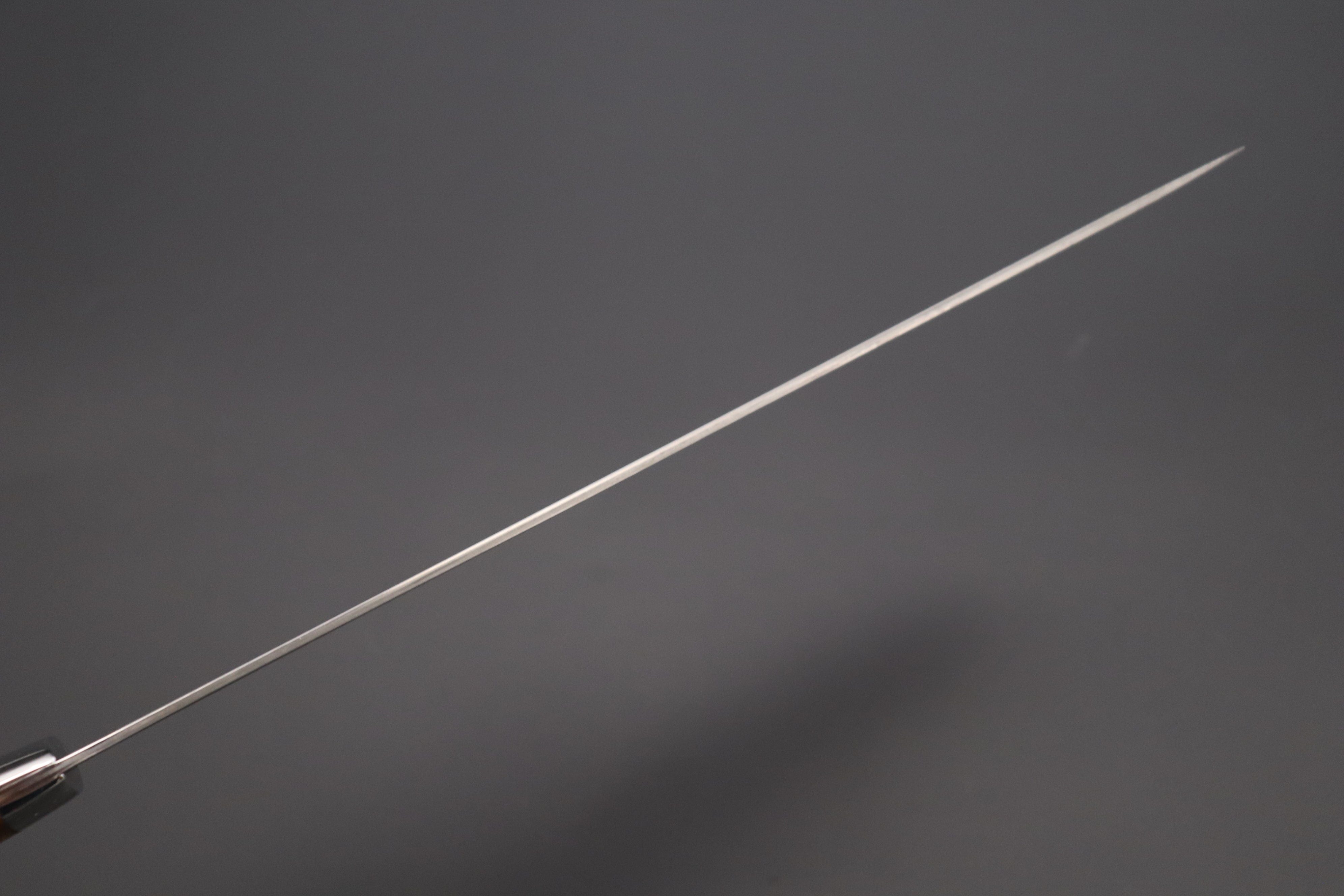 Katana Slicer is easily identifiable by their blade tips, which look similar to that of a Katana. The long, narrow blade of Katana slicer is particularly useful for slicing meat, boneless fish, roast beef and ham. The long blade allows the meat or fish to be cut in one single drawing motion, from heel to tip.