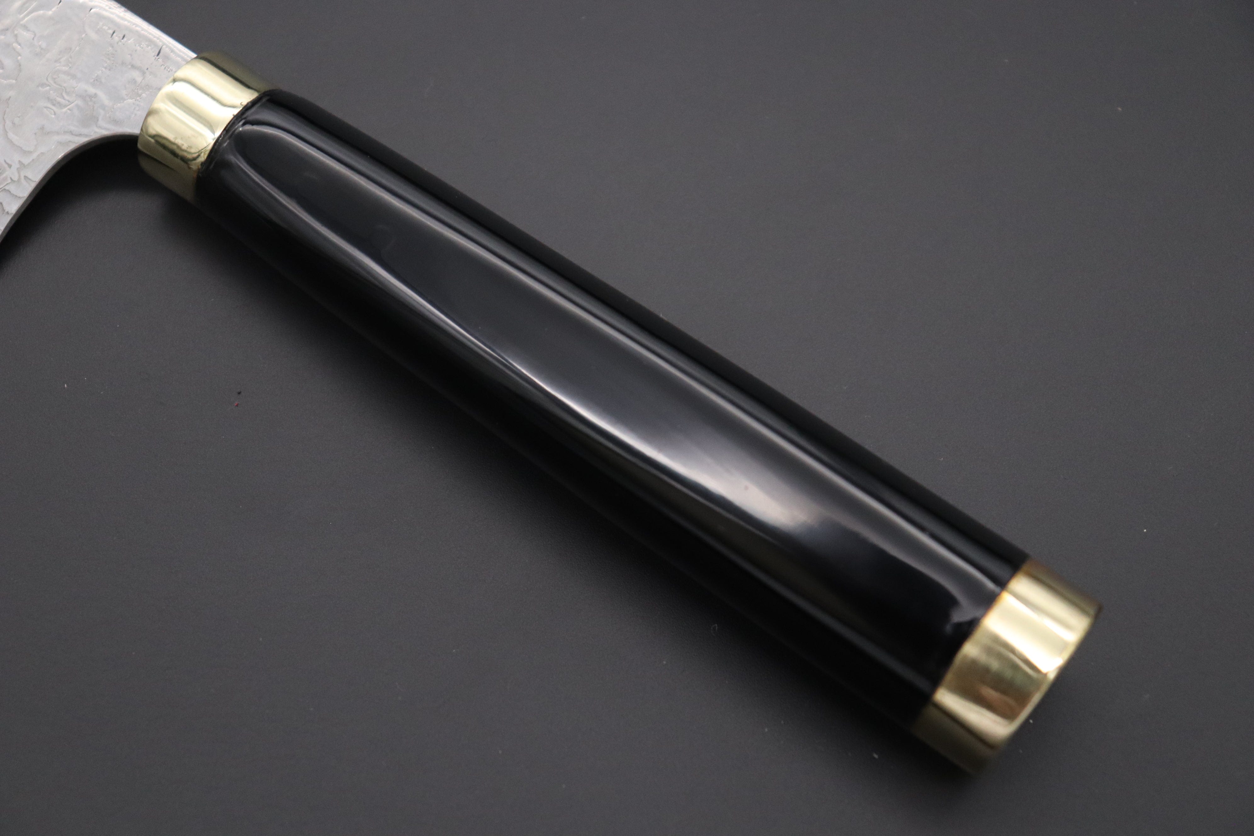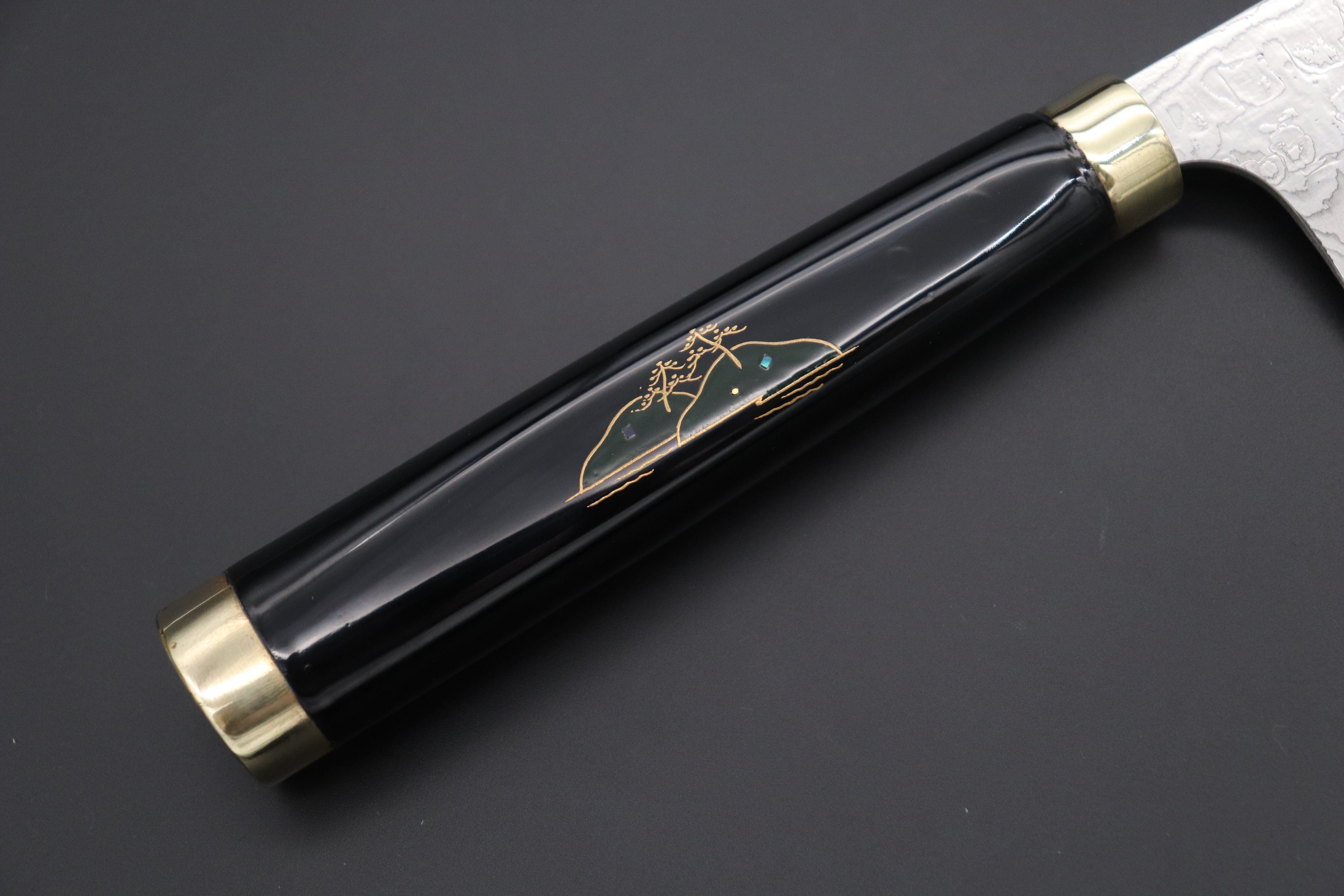 In order to match the very impressive and deep-impact of Maki-e artwork, Master Saji has created -2 Powdered Metallurgy High Speed Tool Steel Custom Damascus bade that has a unique ‘random pattern’ Damascus that Master Saji calls “Diamond Damascus”. It is handcrafted using a complex series of forging processes and a specially formulated acid etching and polishing that, in combination, produce a unique Damascus blade that has a sparkling diamond pattern and an uneven surface texture. You can sense Master Saji’s vitality and powerful spirit is present inside the blade. Each blade has a traditional Hamaguri-ba (Convex) grind, a hidden blade tang, a brass bolster & butt, and a handle that has been painted with black Urushi lacquer (Waterproof).